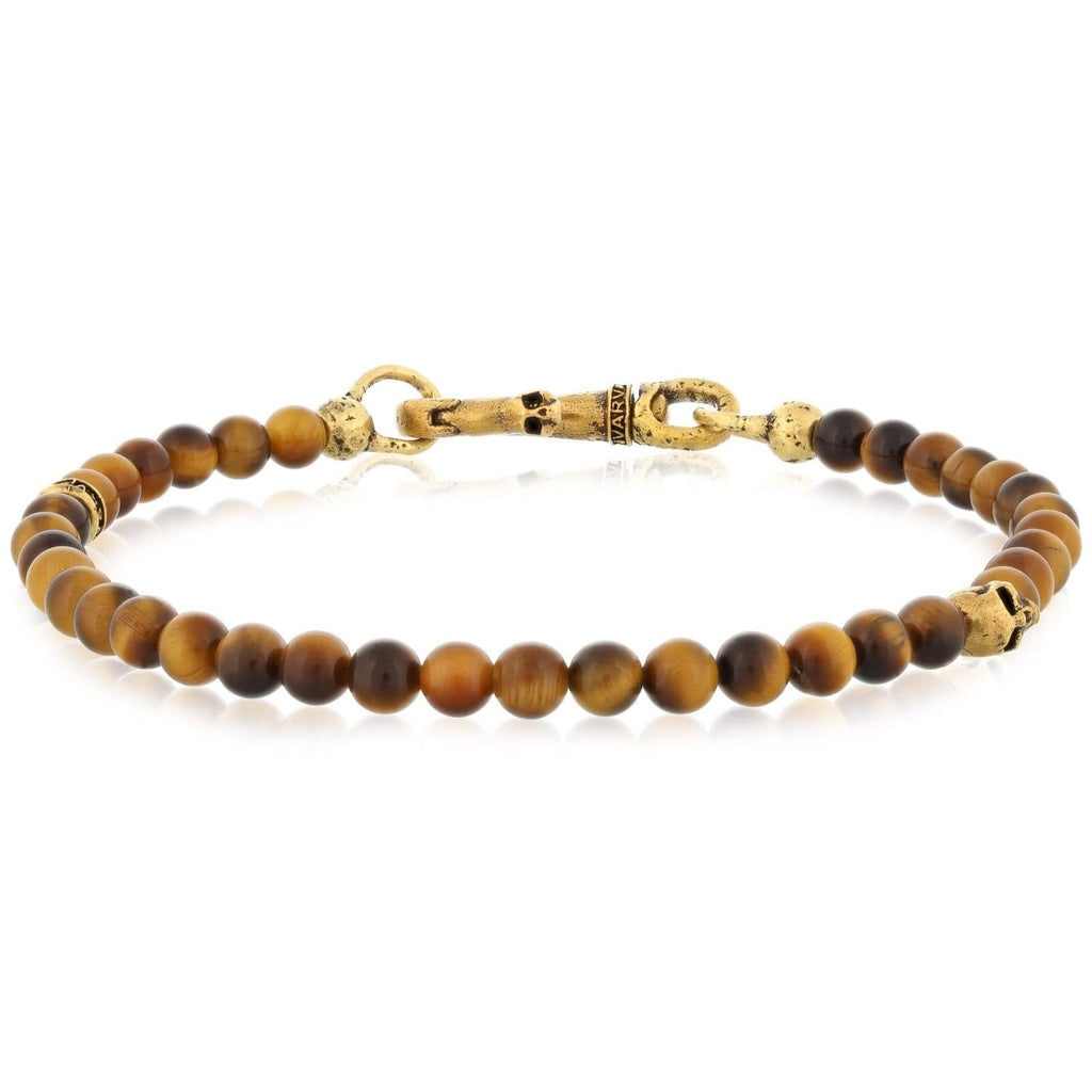 Silver and brass tigers eye beaded bracelet featuring a brass skull fold over clasp. The bracelet measures 8" in length. Designed by John Varvatos.