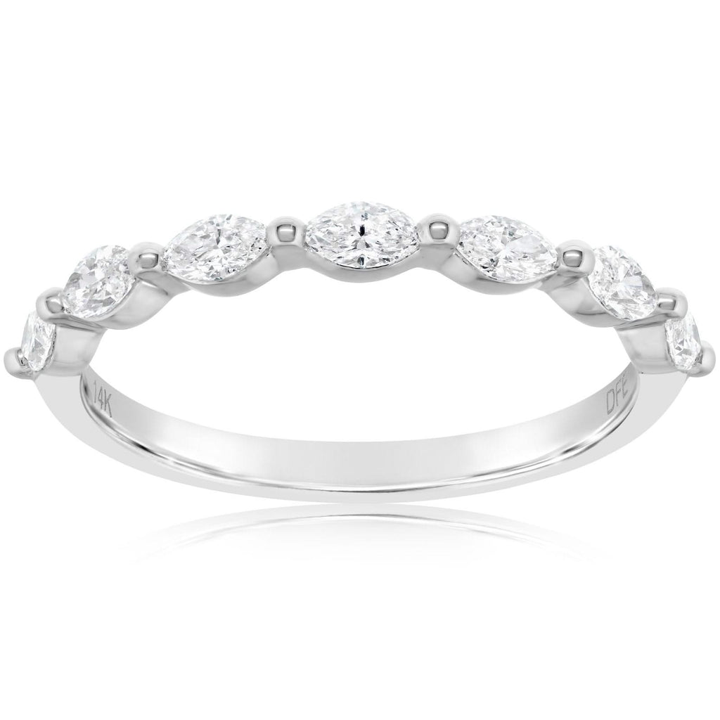 14K white gold diamond wedding band from the Reis-Nichols Collection. The band features five marquise cut and four brilliant round cut diamonds weighing .55 ctw. Size 6.5 in stock now. Special order sizes also available. Pricing may vary with size of ring.