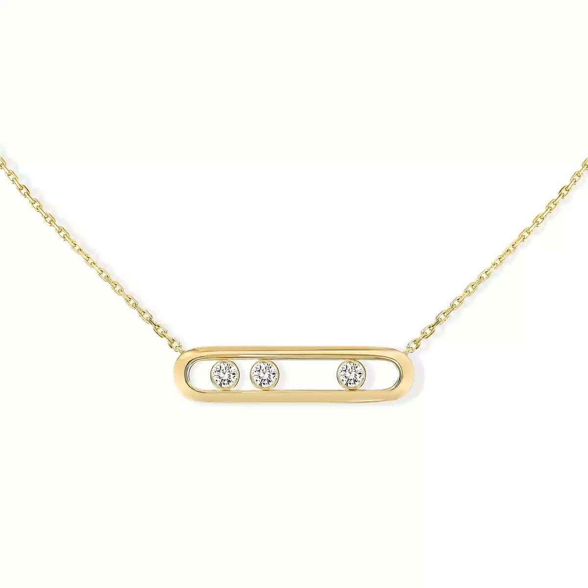18K yellow gold Move diamond necklace featuring three round brilliant cut diamonds weighing approximately 1/5 ctw (.20-.27). The chain features two flush set round brilliant cut diamonds weighing .01 ctw. The necklace is 15-18" in length. Designed by Messika.