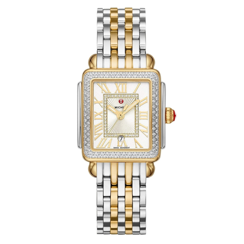Stainless steel and yellow gold plated Michele Deco Madison Mid quartz watch featuring a white roman date dial with a diamond bezel. The watch case is 29mm and is attached to a stainless steel and yellow gold plated bracelet.