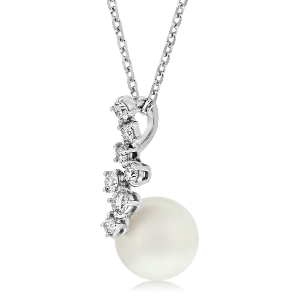 18K white gold akoya pearl and diamond pendant featuring one 8.5MM, A+ akoya pearl, and round brilliant cut diamonds weighing .25 ctw. The pendant is 16-18" in length. Designed by Mikimoto.