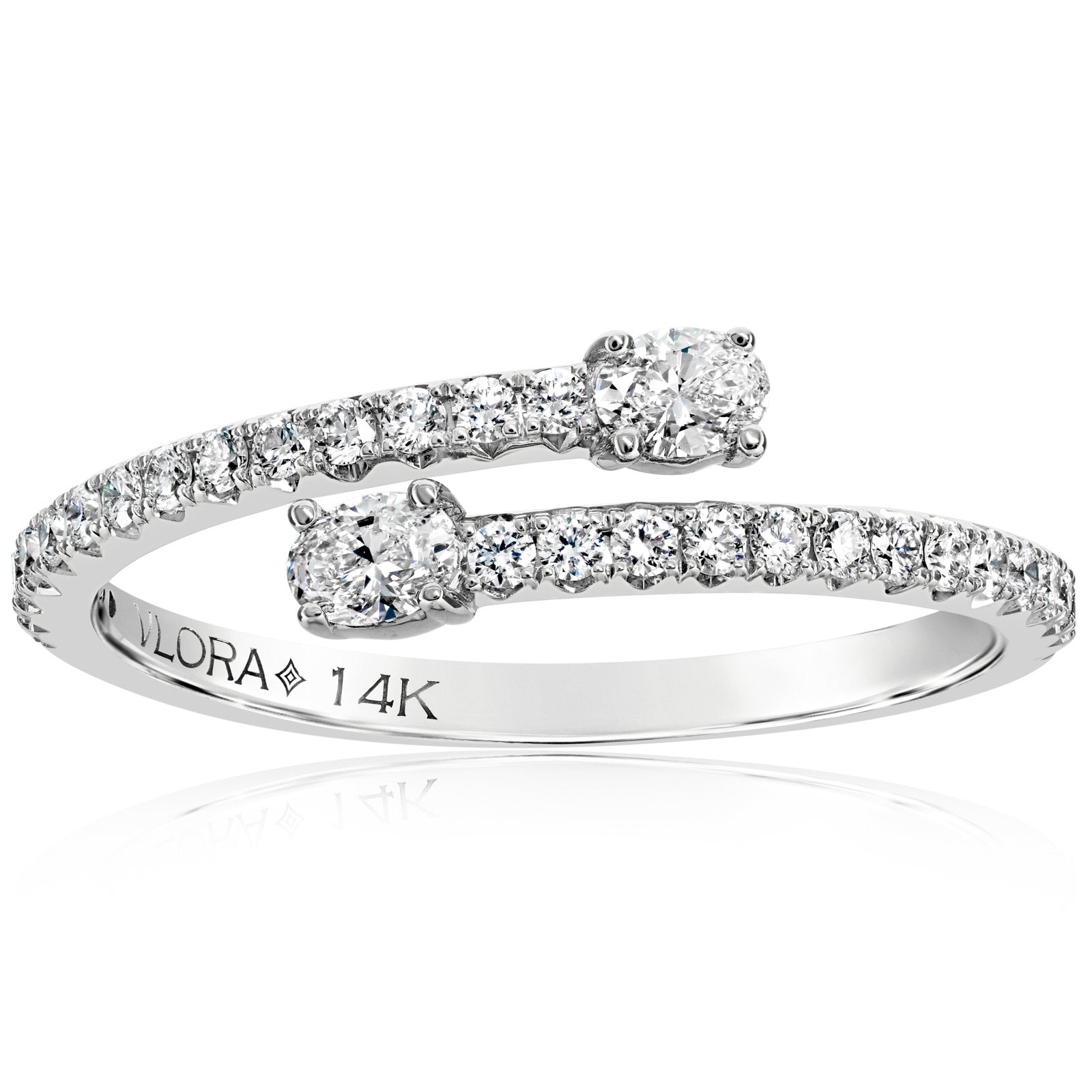 14K white gold diamond fashion bypass ring from the Reis-Nichols Collection. The ring features two ovals, and 28 round brilliant cut diamonds weighing nearly 1/2 ctw. Size 6.5 in stock now. Please call or email for details on special order sizes and availability.