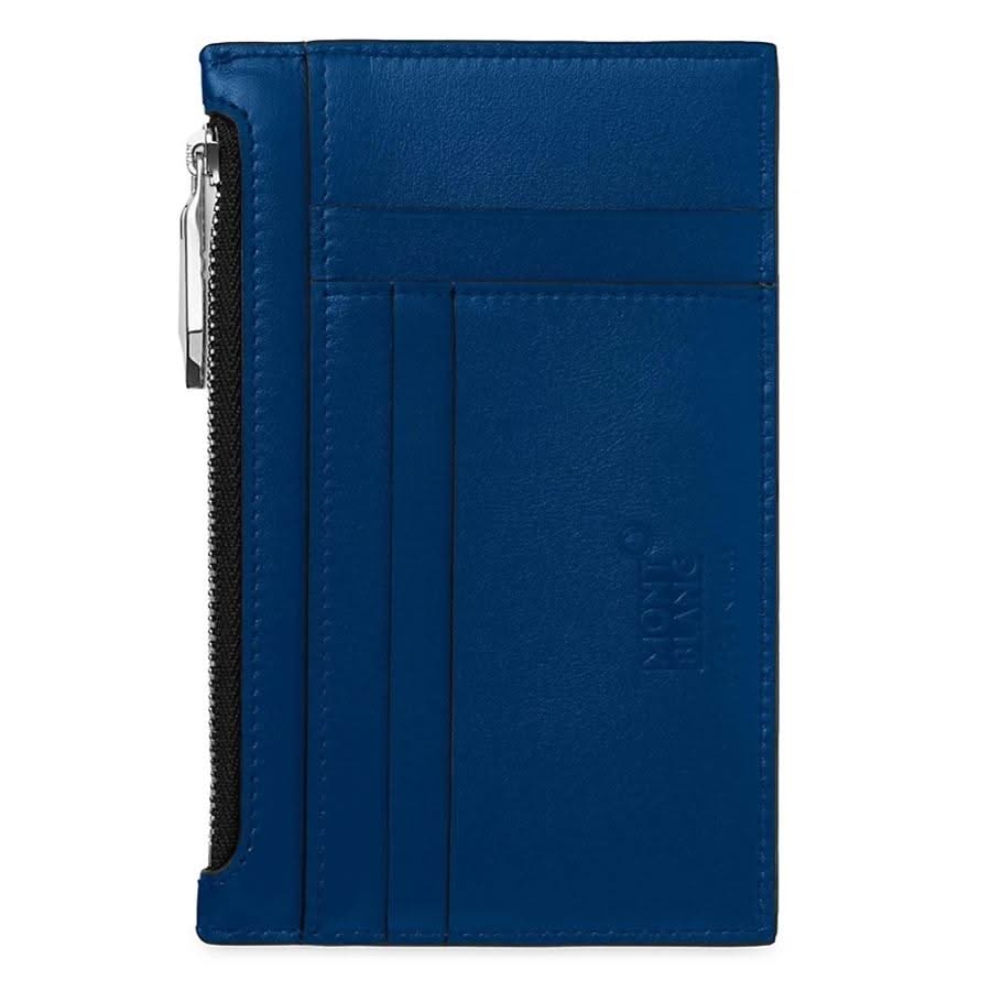 Blue leather Meisterstück pocket wallet featuring eight credit card slots. Designed by Montblanc.
