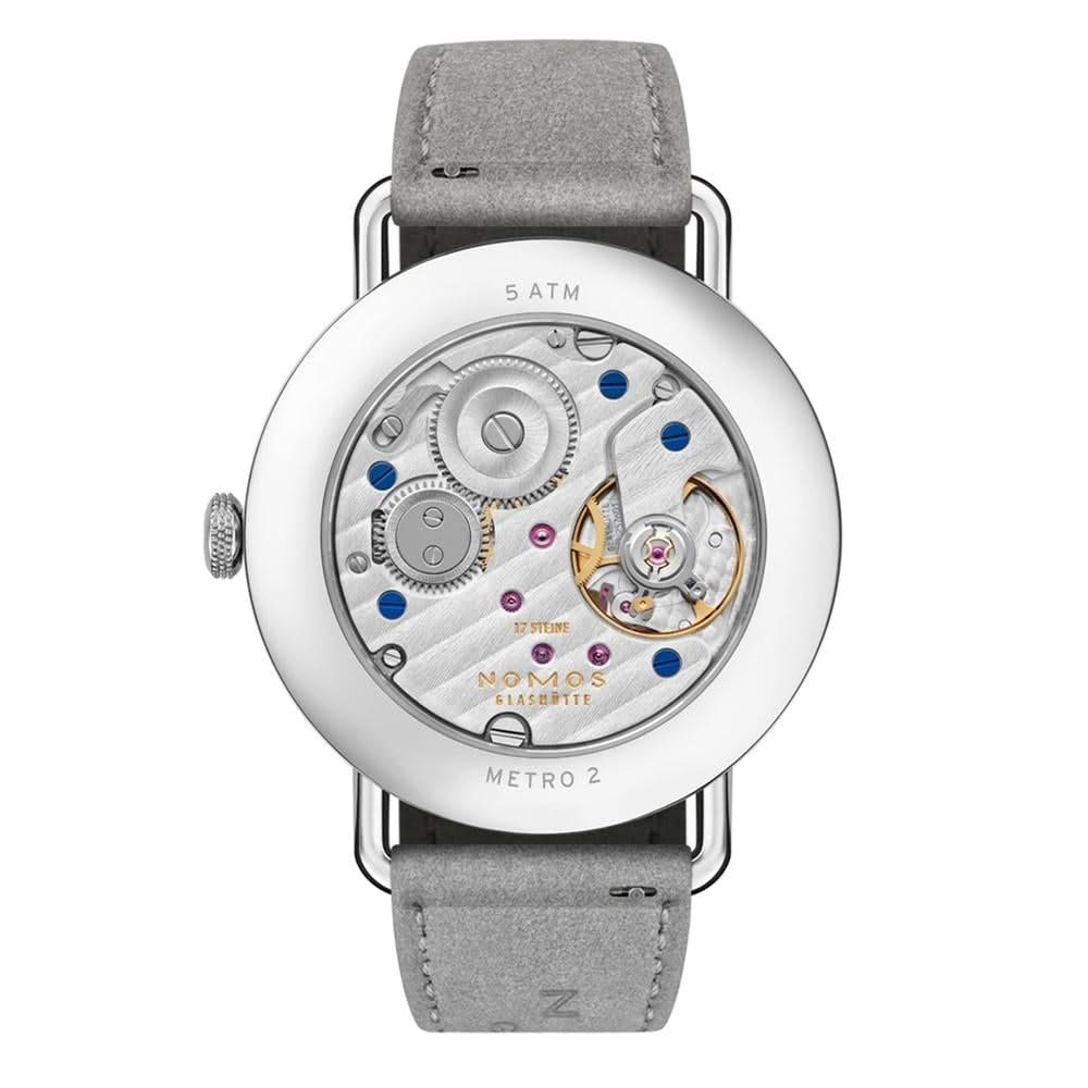 Stainless steel Nomos Metro manual watch featuring a sage index dial, a high polished bezel and case with a sapphire crystal glass back. The watch case is 33mm and is attached to a grey velour leather strap.