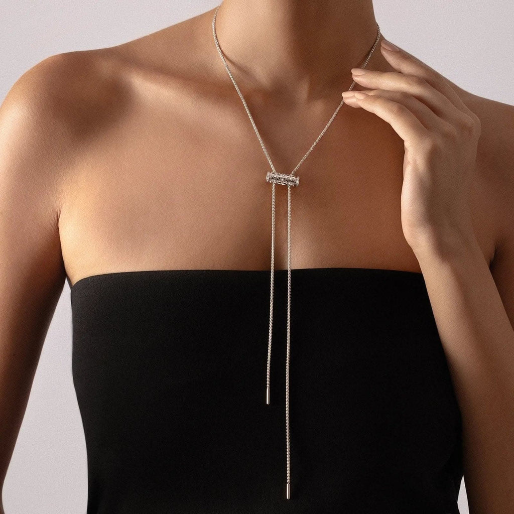 18K white gold latch chain that features two round brilliant diamonds weighing .02 ctw. The chain measures 33" in length. Latch pendant sold separately. Designed by Nouvel Heritage.