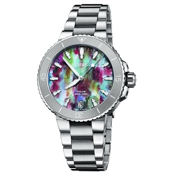 Stainless steel Oris Aquis Date Upcycle automatic watch featuring a multi-colored index date dial with a grey ceramic bezel. The watch case is 36.5mm and is attached to a stainless steel bracelet.