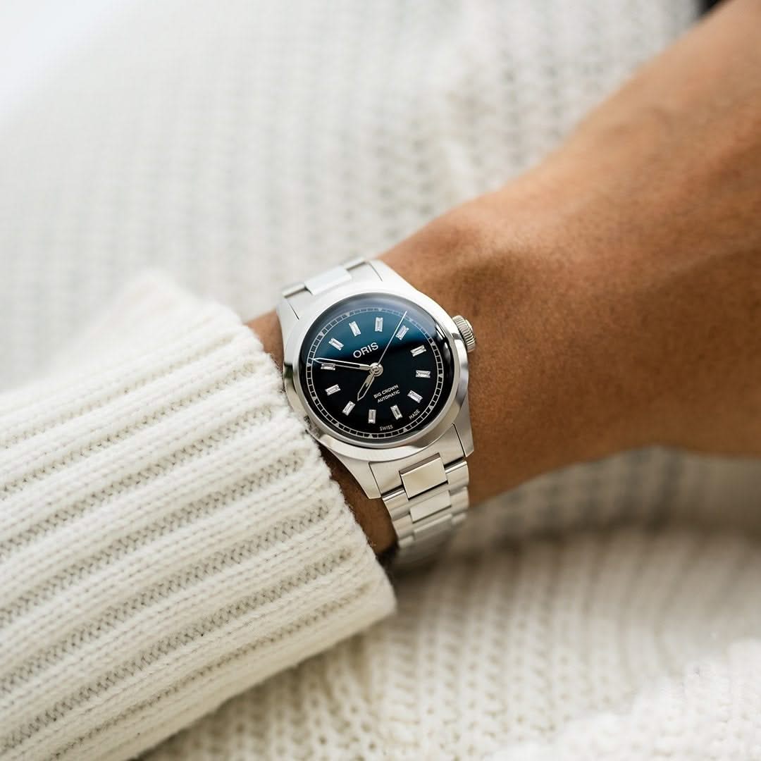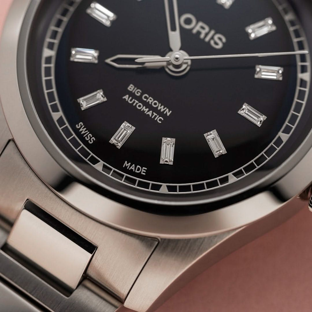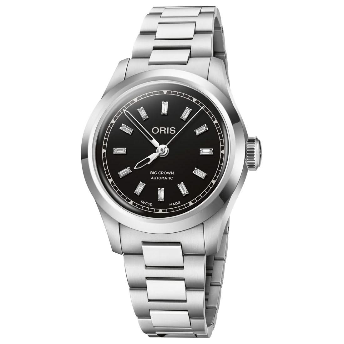 Stainless steel Oris Big Crown automatic watch featuring a black diamond dial with a stainless steel bezel and case. The watch case is 34mm and is attached to a stainless steel bracelet. Model number 01 531 7797 4094-07 8 17 06.