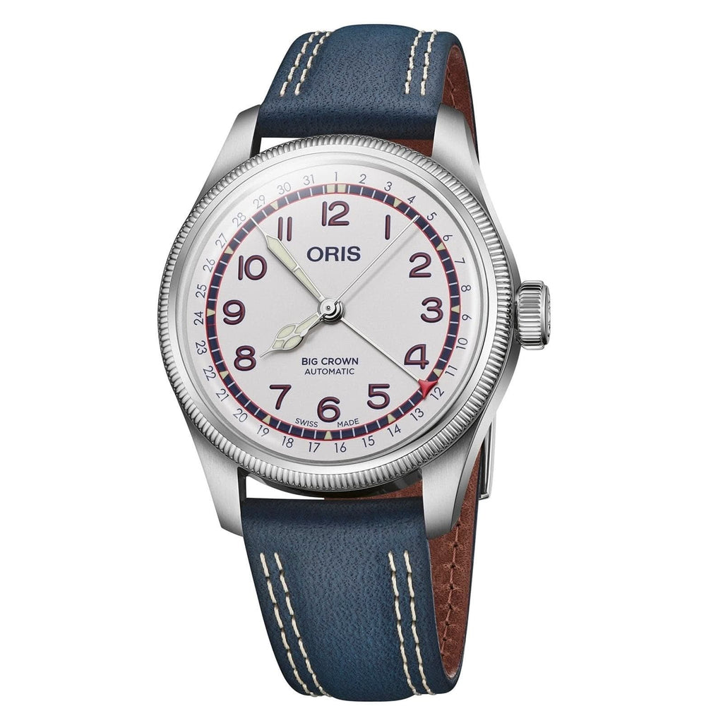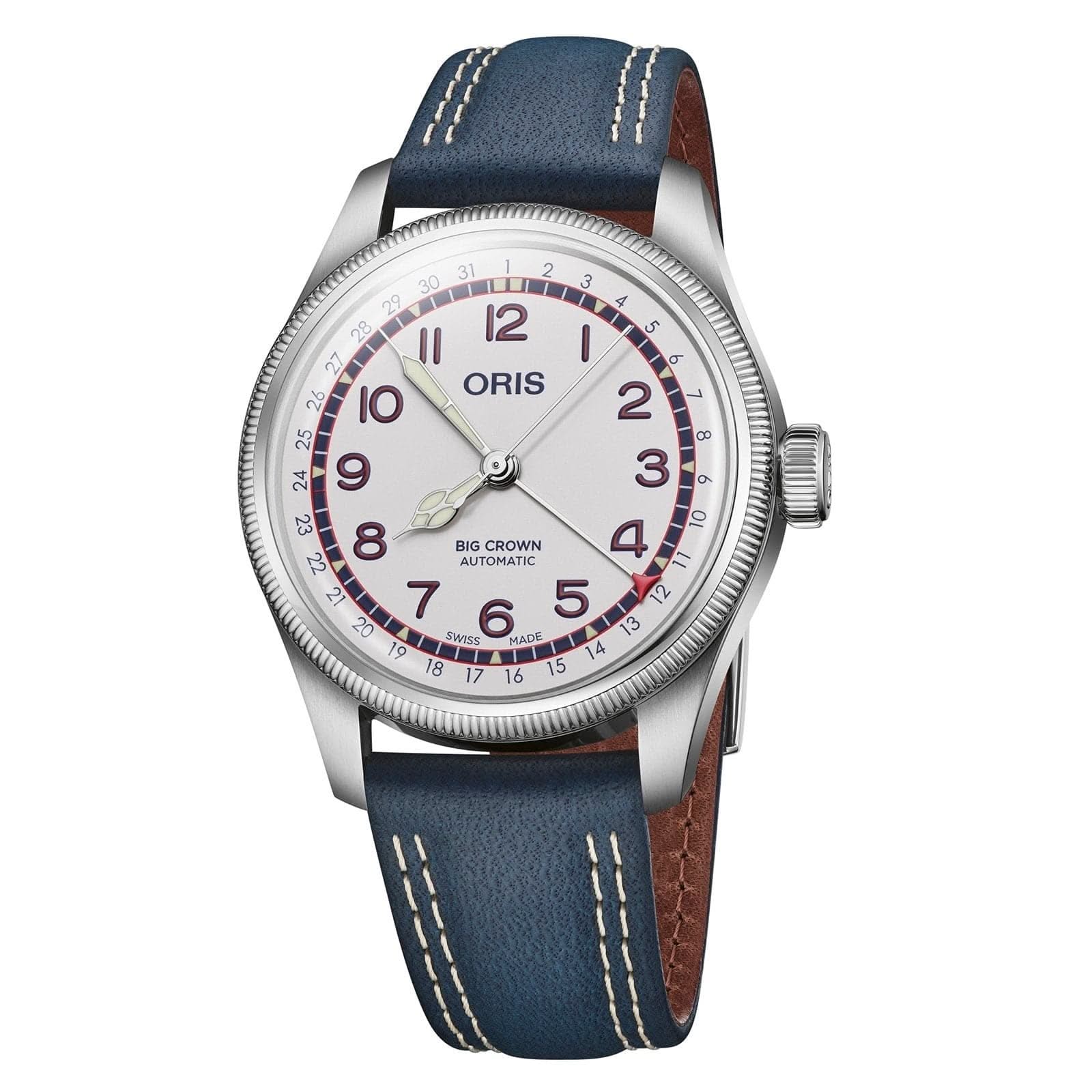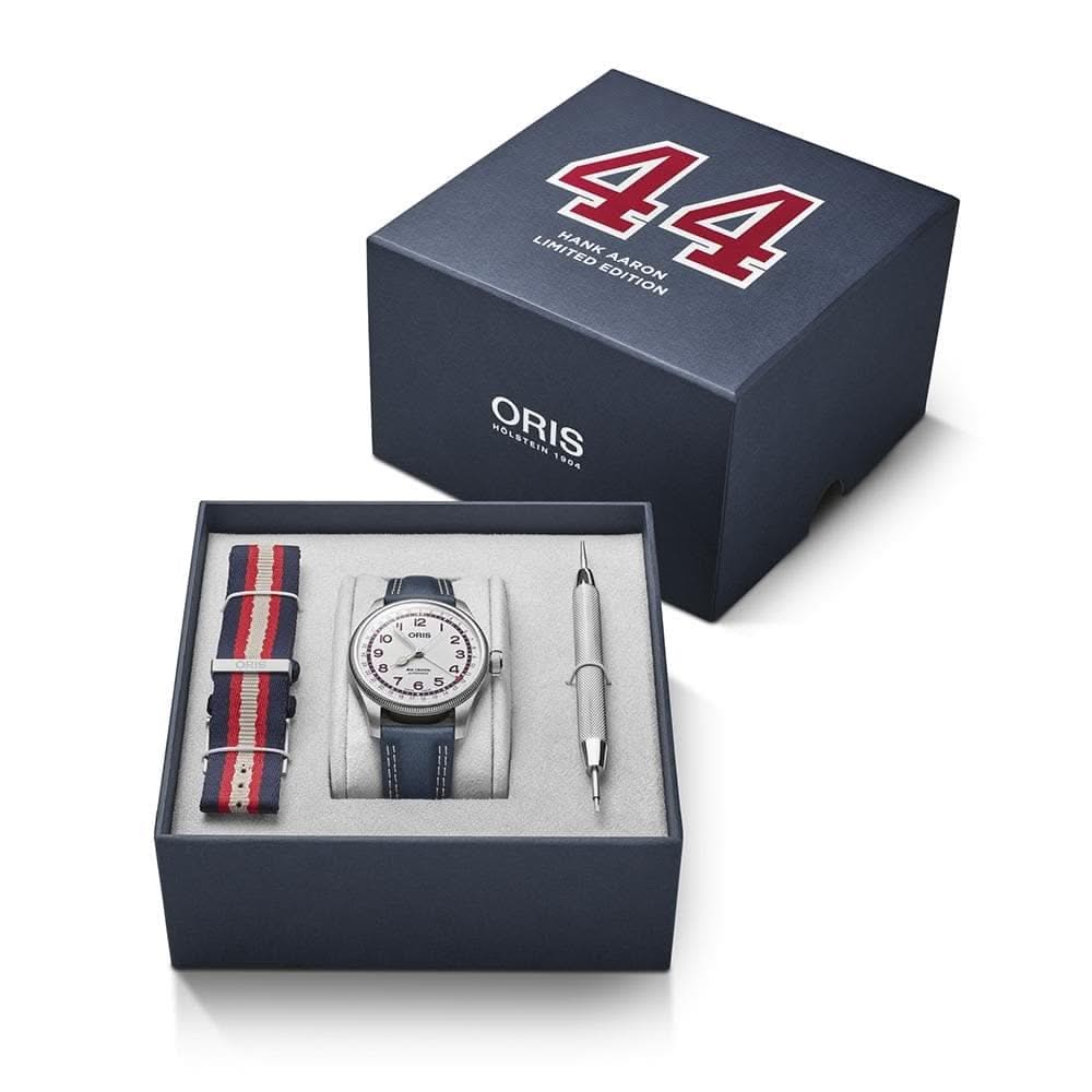 This limited edition watch is based on Oris’ signature design, the Big Crown Pointer Date, with touches that point to the great man and his record-breaking career. The color palette of blue, red, and white is inspired by Hank Aaron’s famous baseball uniform. The palette is subtly applied to reflect Aaron’s humble attitude: in the blue-outlined red numerals; in the red outlined blue minutes ring that runs around the dial; and in the blue leather strap, which is finished with white stitching akin to the stitching on a baseball glove. It comes with an interchangeable blue, red, and white NATO fabric strap and a strap change tool.
