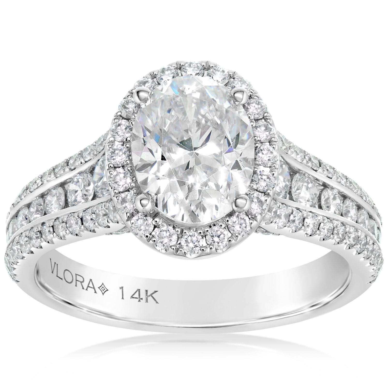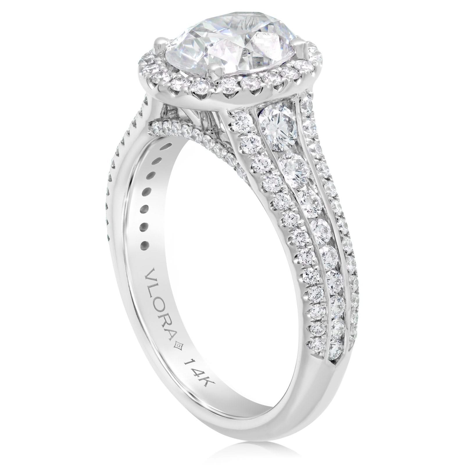 14K white gold diamond engagement ring setting from the Reis-Nichols Collection. The setting features 108 round brilliant cut diamonds weighing nearly 1 ctw. The ring setting is designed to hold a 1.5ct oval center diamond. Center sold separately. Size 6.5 in stock now. Special order sizes available. Pricing may vary with size.