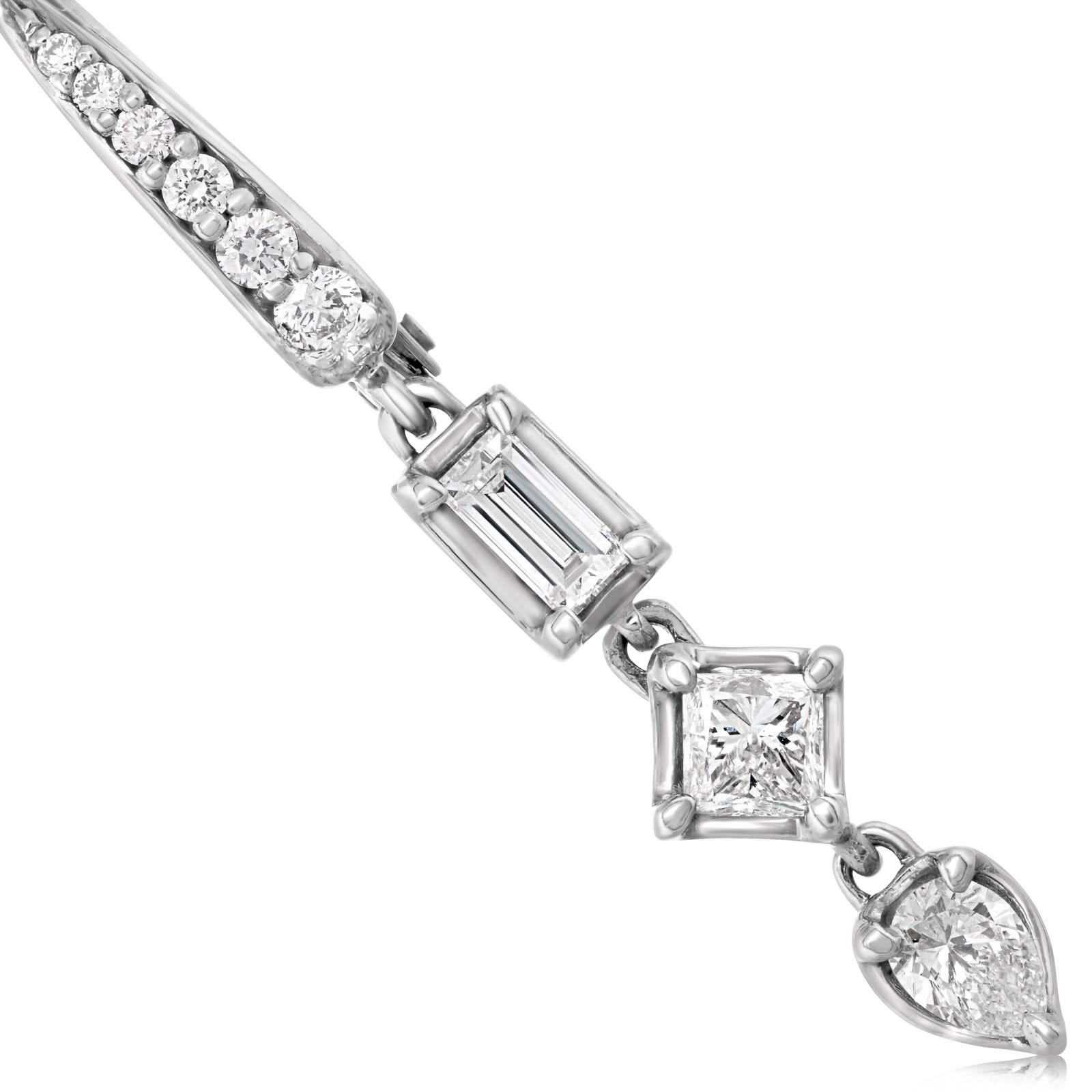 18K white gold Classic mixed diamond drop earrings featuring two baguette cut diamonds, two princess cut diamonds, two pear-shaped diamonds, and 12 round brilliant cut diamonds weighing 1.00 ctw. Designed by Penny Preville.
