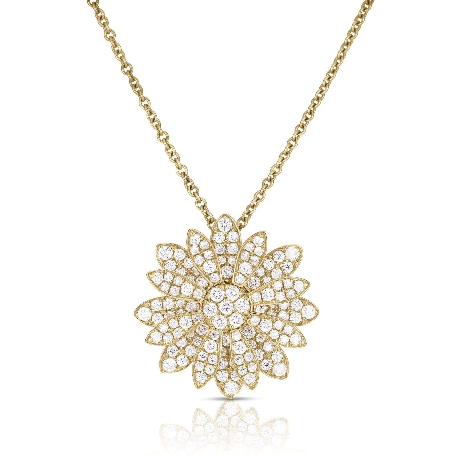 18K yellow gold pave diamond Margherita pendant featuring round brilliant cut diamonds weighing 1.03 ctw. The pendant is 16-18" in length. Designed by Roberto Coin.