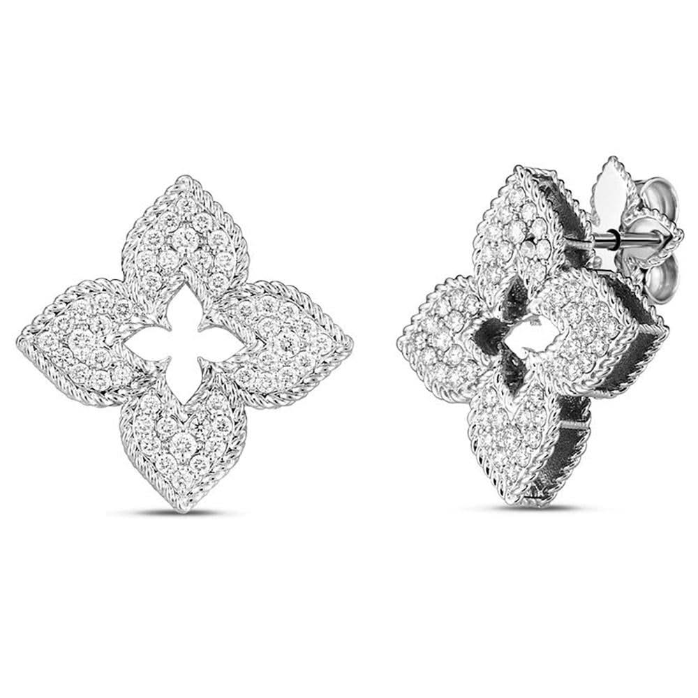 18K white gold diamond Venetian Princess stud earrings featuring 40 round brilliant cut diamonds weighing .30 ctw. Designed by Roberto Coin.