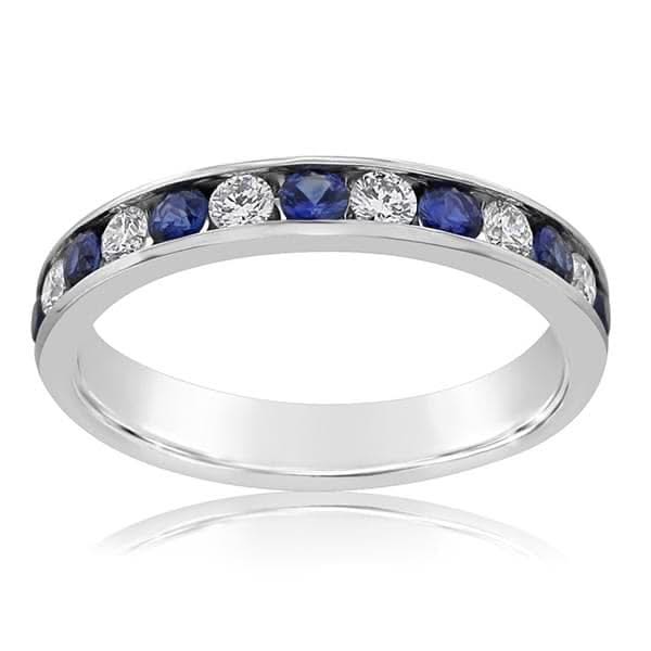 18K white gold diamond and sapphire band from the Reis-Nichols Collection. The band features seven round blue sapphires weighing .48 ctw and six round brilliant cut diamonds weighing 0.33 ctw. Size 6.5 in stock now. Special order sizes also available. Pricing may vary with size of ring.