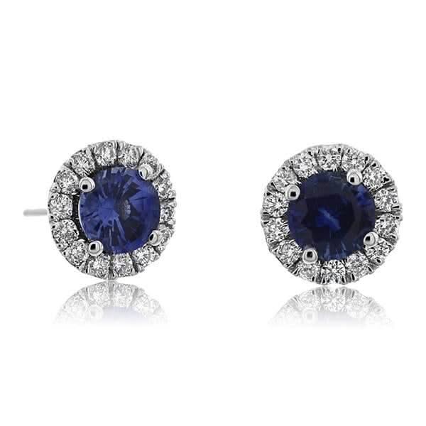 14K white gold sapphire and diamond halo stud earrings from the Reis-Nichols Collection. The earrings feature two round sapphires weighing approximately 1 3/4 ctw and 28 round brilliant cut diamonds weighing approximately 1/2 ctw.