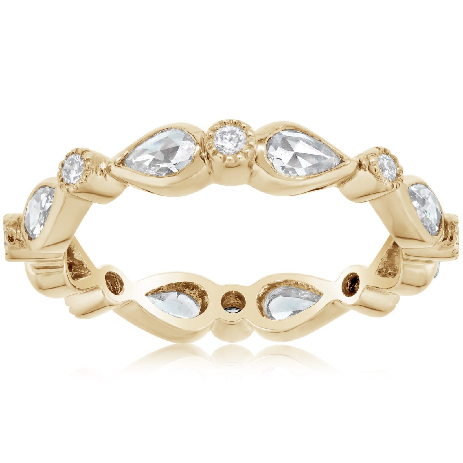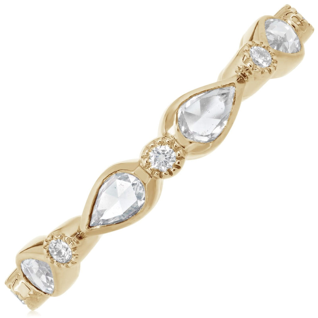 18K yellow gold rose cut pear and round diamond eternity band featuring eight rose cut pear-shaped diamonds and eight round brilliant cut diamonds weighing .77 ctw. Size 6 in stock now. Special order sizes also available. Designed by Sethi Couture.