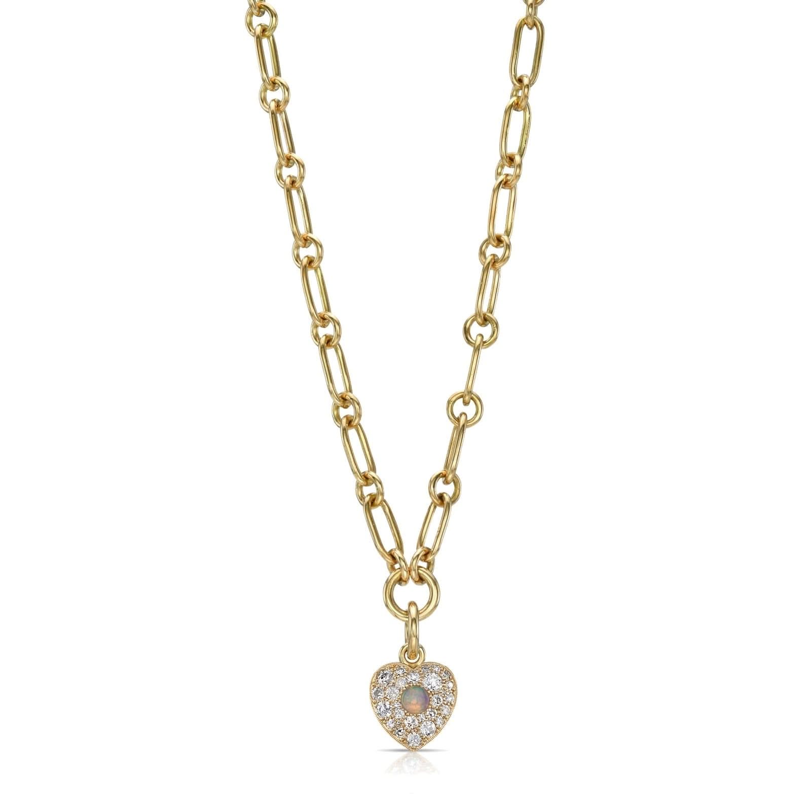 18K yellow gold small Cobblestone opal heart pendant featuring one opal cabochon weighing .11 ct, and various old and round cut diamonds weighing .69 ctw. The pendant is 17" in length. Designed by Single Stone.