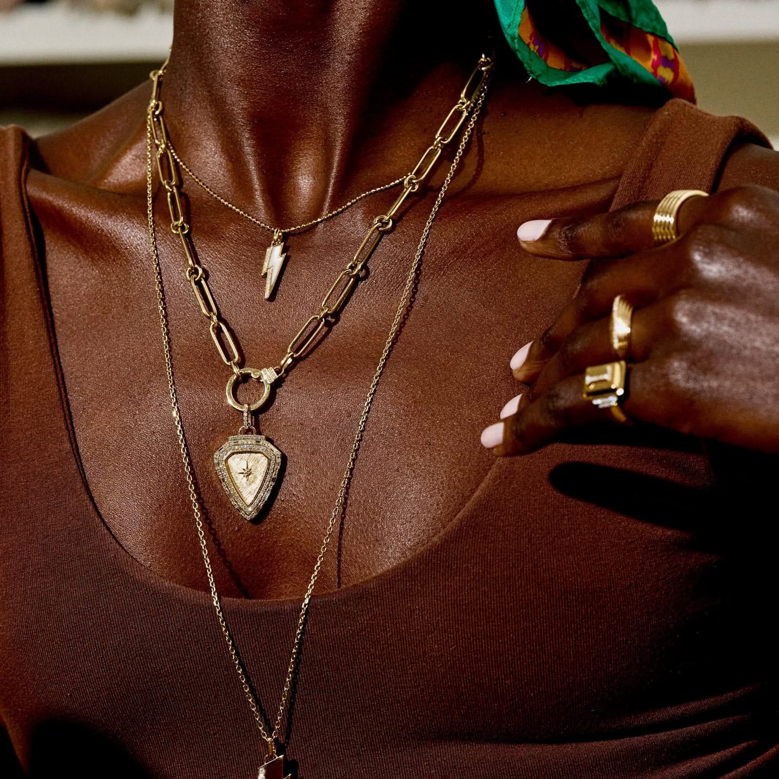 18K yellow gold mother of pearl Mini Ziggy Bolt pendant featuring round brilliant cut diamonds weighing .08 ctw. Designed by Sorellina.