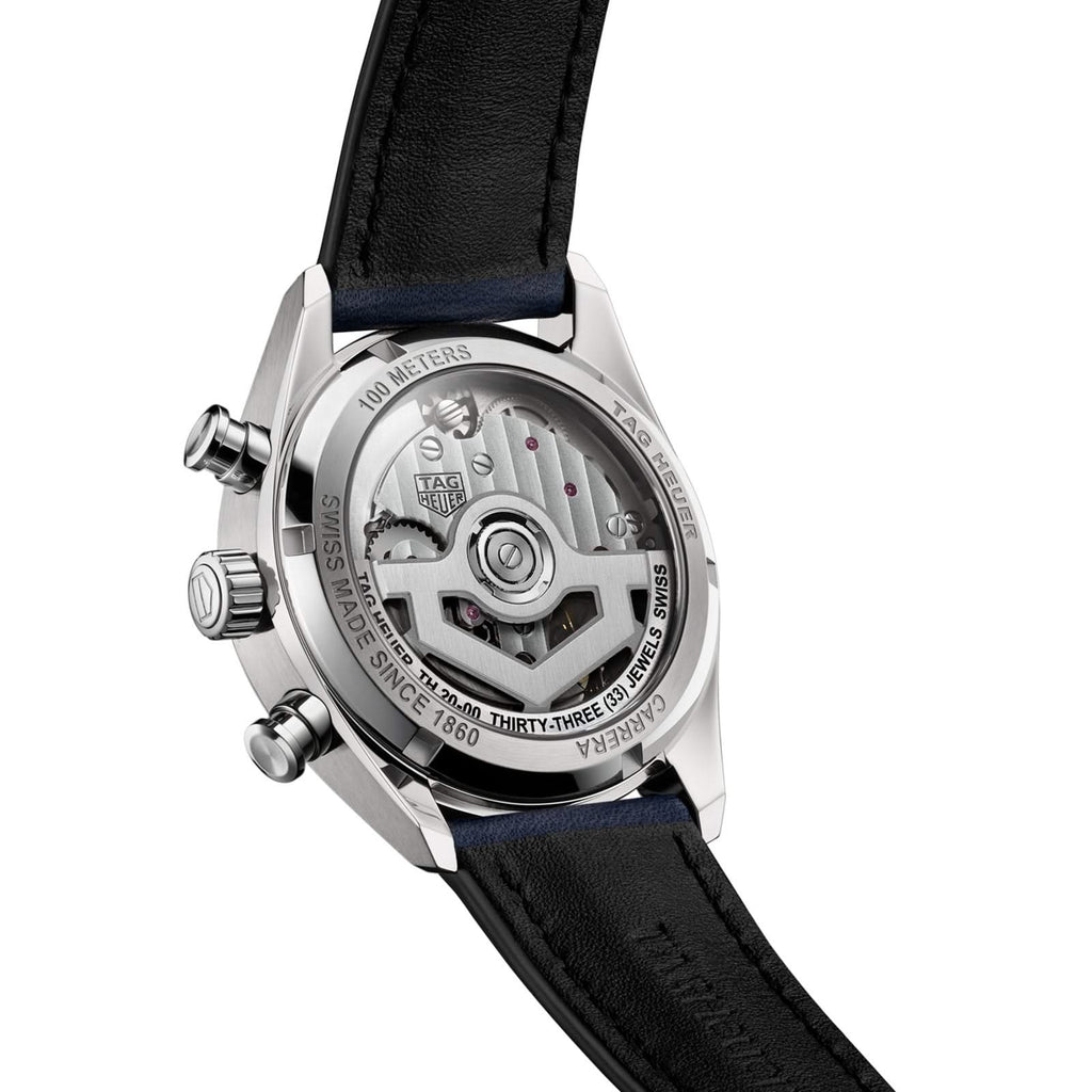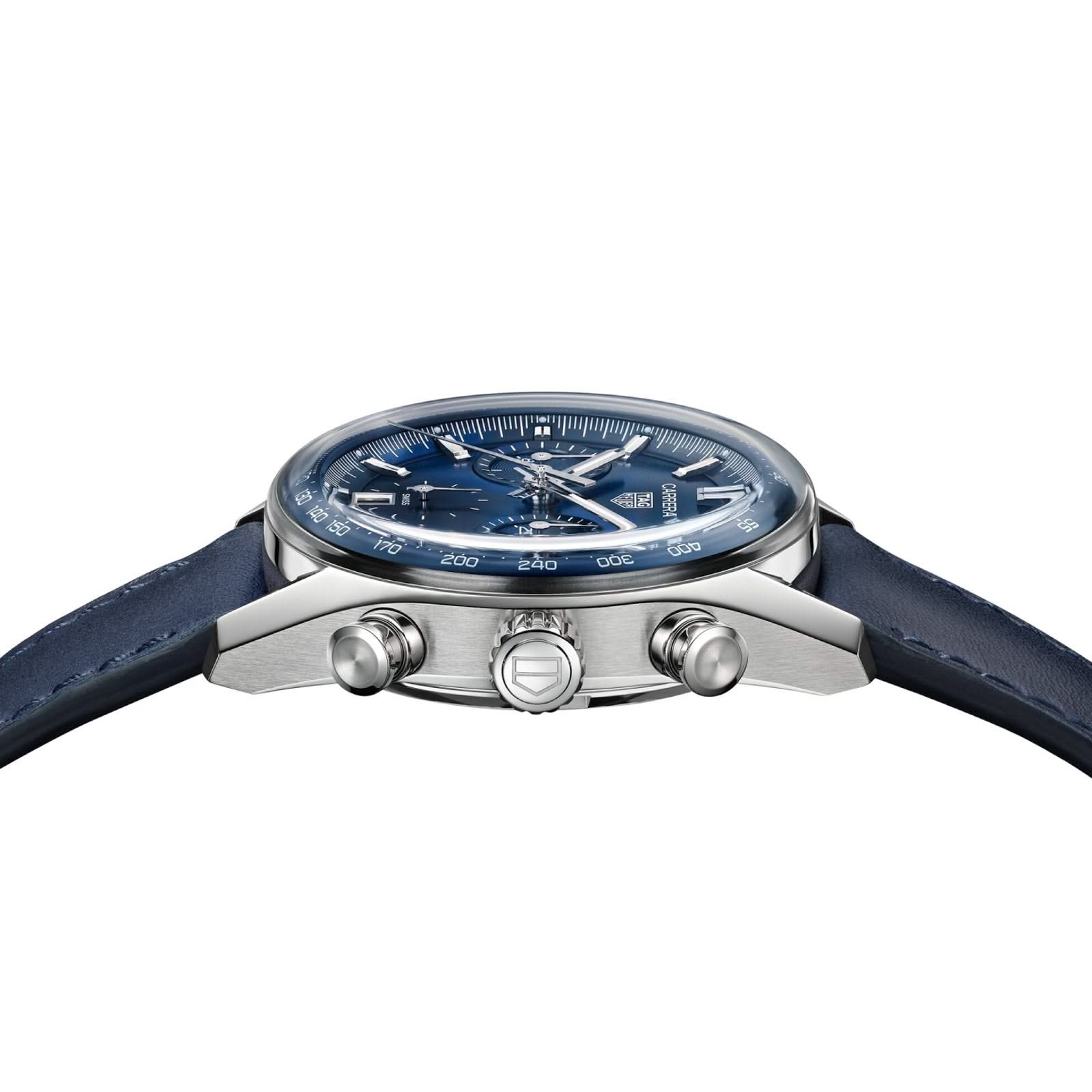Perfectly matching the blue calfskin leather bracelet, the deep blue-themed dial of this TAG Heuer Carrera is driven to dare. The dial’s iconic Tricompax layout is ultra-legible thanks to the domed sapphire crystal hugging the flange’s curve, while the in-house Calibre TH20-00 automatic movement brings unparalleled precision and power. A born racer.