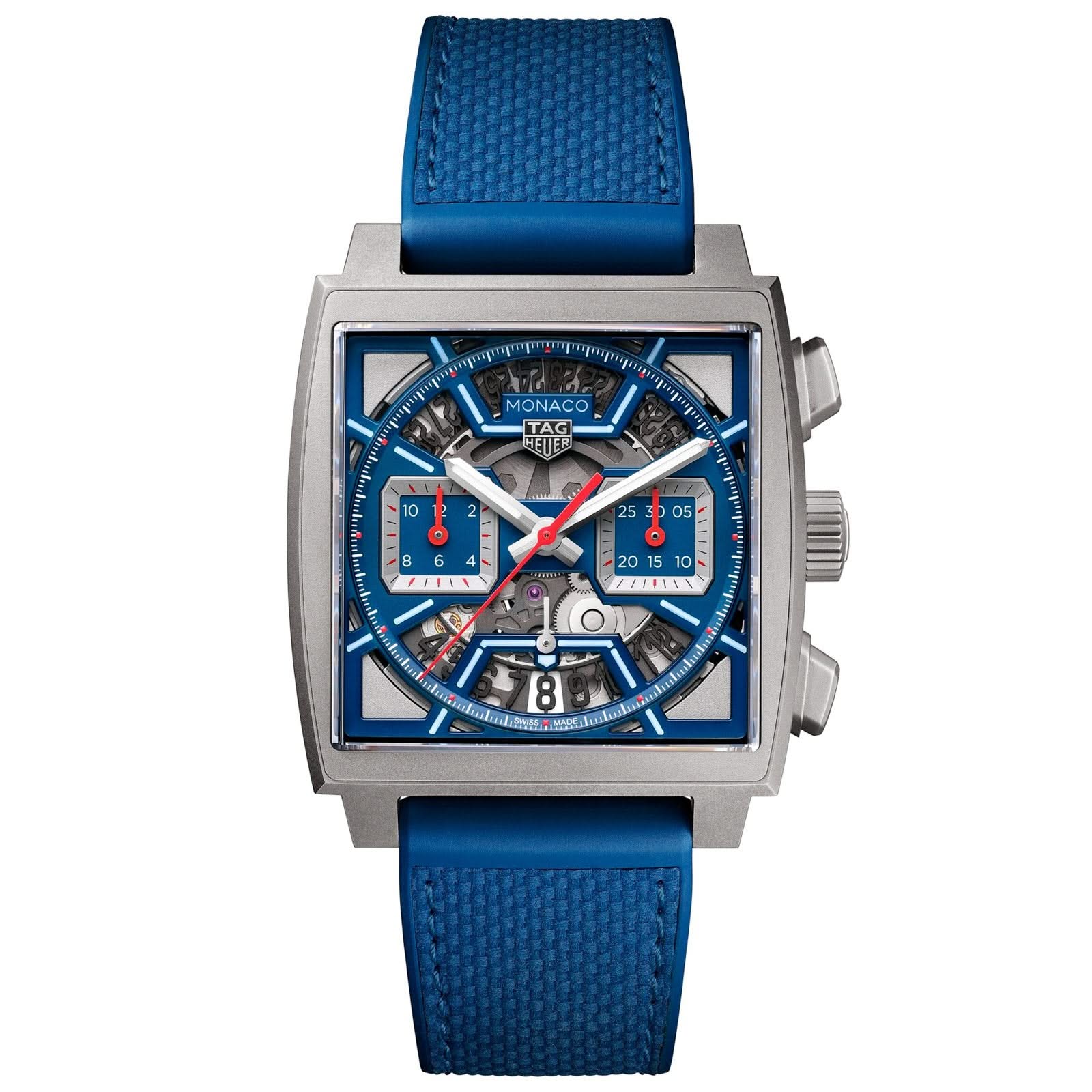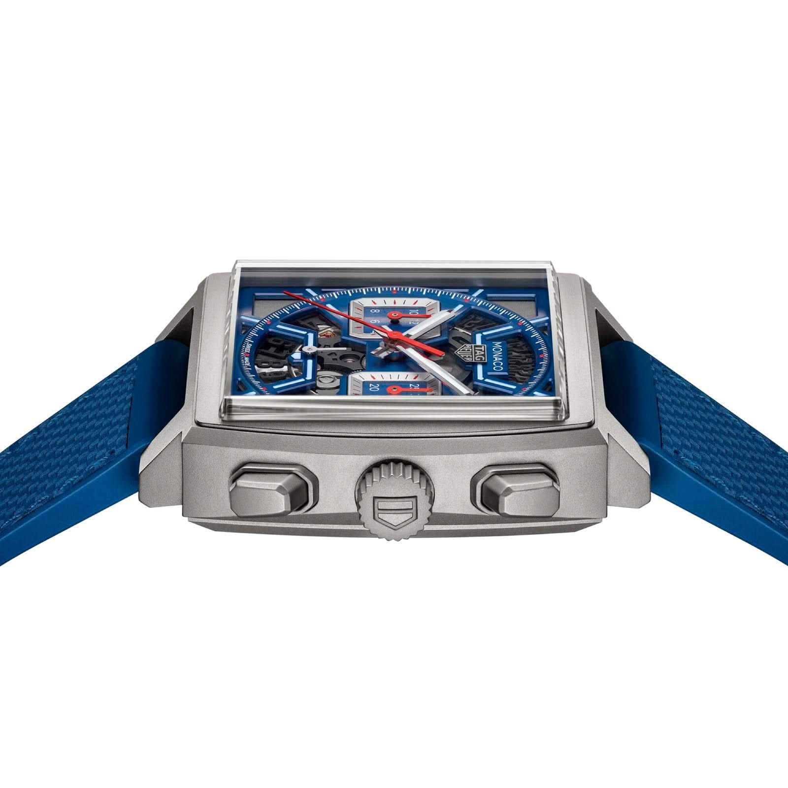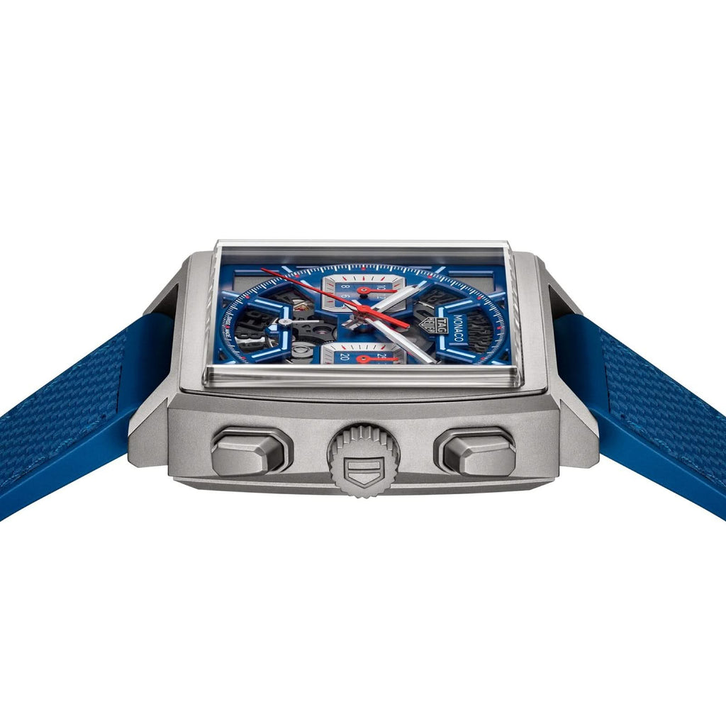 Enhanced by red and white highlights, the striking skeletonised dial of this rebellious blue TAG Heuer Monaco pays homage to the original Monaco blue model. Brilliantly crafted, this watchmaking gem integrates the powerful in-house Calibre Heuer 02 movement, visible through the sapphire case back. An unstoppable icon.
