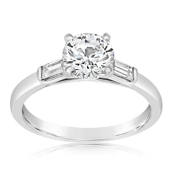 14K white gold three stone diamond engagement ring setting from the Reis-Nichols Collection. The ring features 2 baguette cut diamonds weighing 1/5 ctw. The ring is designed to hold a 1 ct round center diamond. Center diamond sold separately. Please call or email for size information and availability.