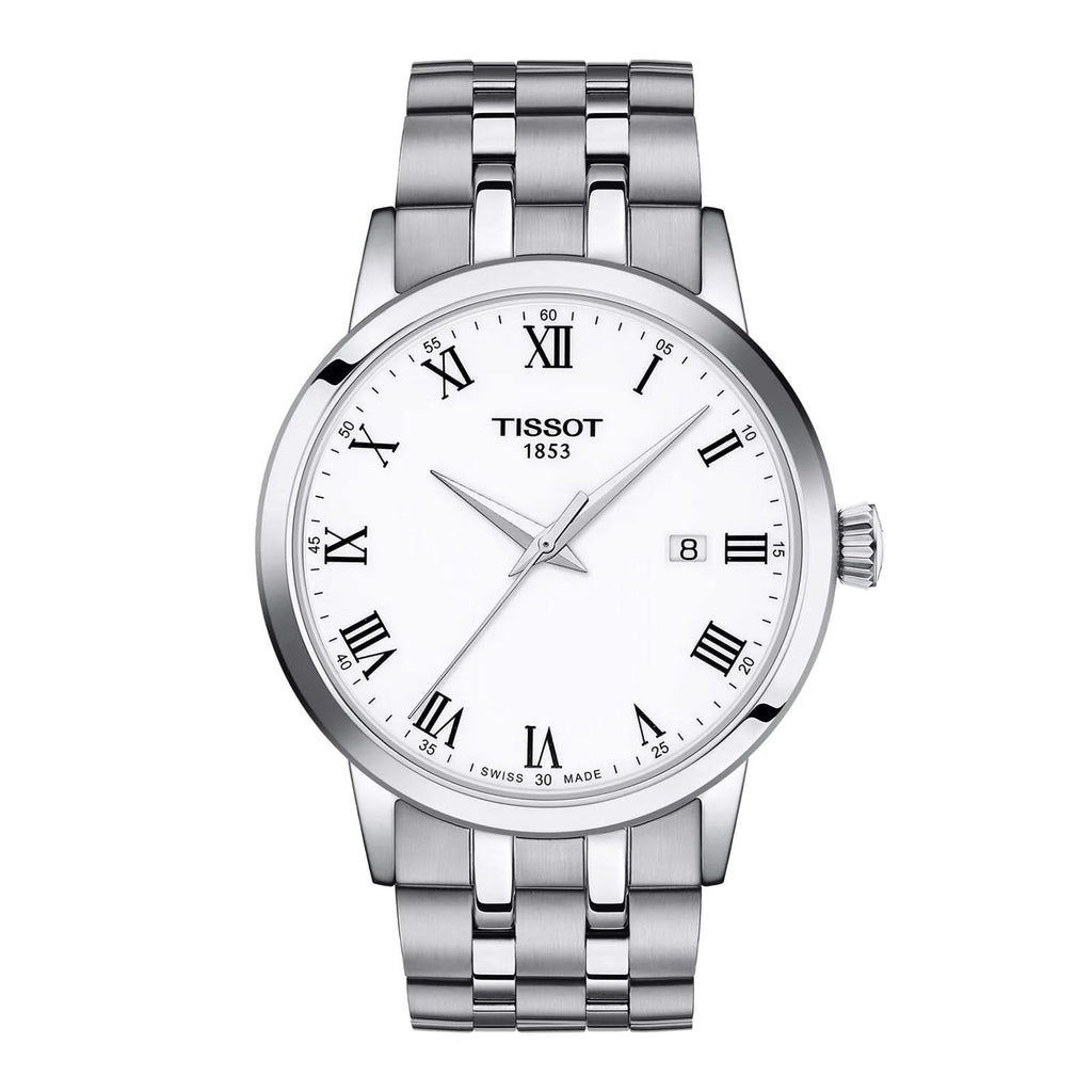 Stainless steel Tissot Classic Dream quartz watch featuring a white Roman date dial with a stainless steel bezel and case. The watch case is 42mm and is attached to a stainless steel bracelet.