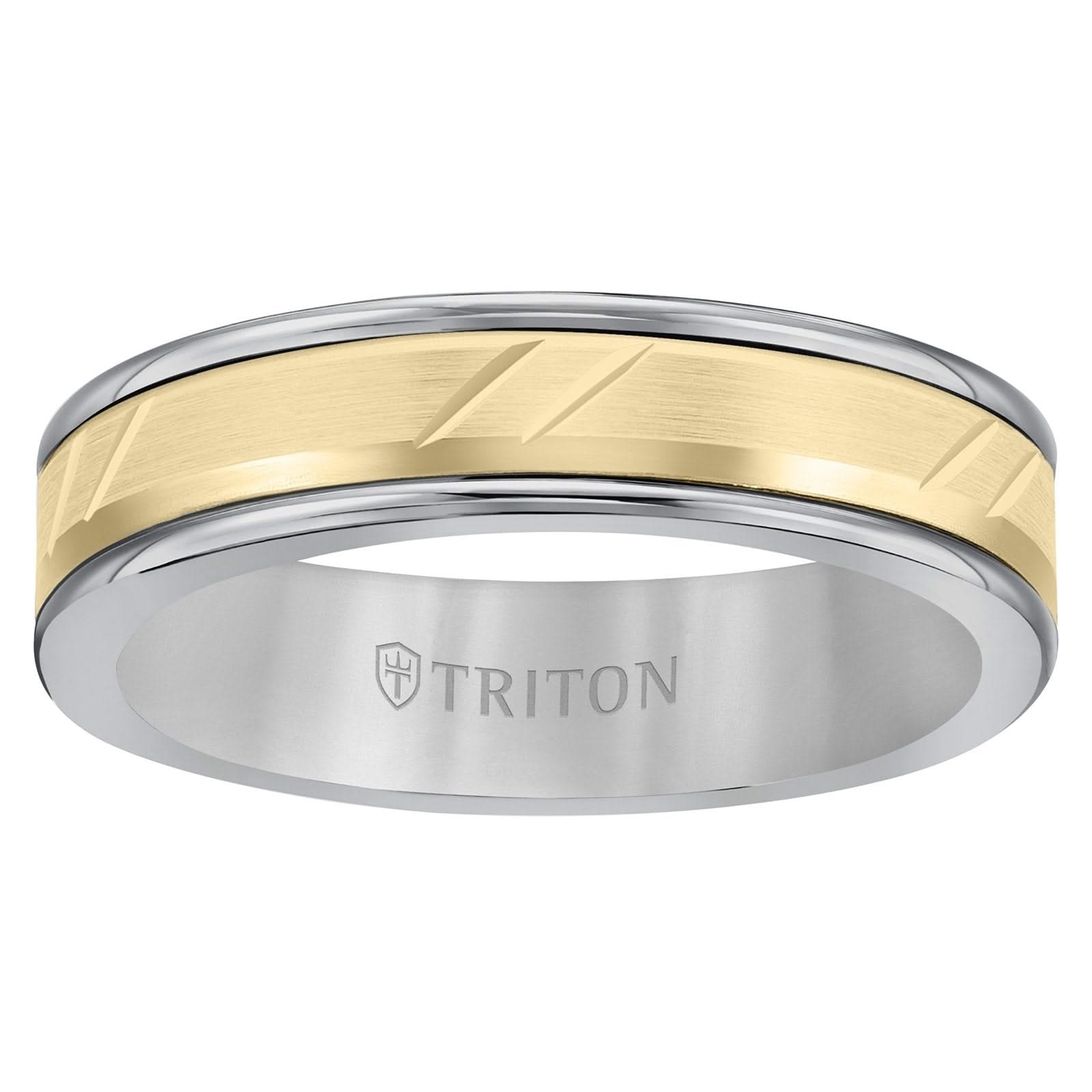 Tungsten and 14K yellow gold comfort fit wedding band featuring a brushed finish yellow gold diagonal cut center with tungsten edges. The band is 6mm wide. Size 10 in stock now. Special order sizes also available. Pricing may vary with size of ring. Designed by Triton.