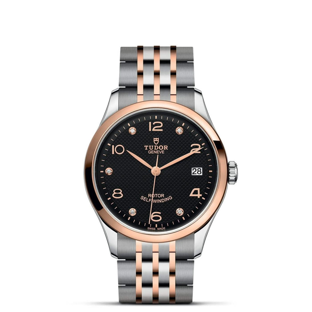 Stainless steel and 18K rose gold Tudor 1926 automatic watch featuring a black decorated arabic/diamond date dial with a high polished 18K rose gold bezel and a stainless steel case. The watch case is 36mm and is attached to a stainless steel and 18K rose gold bracelet.