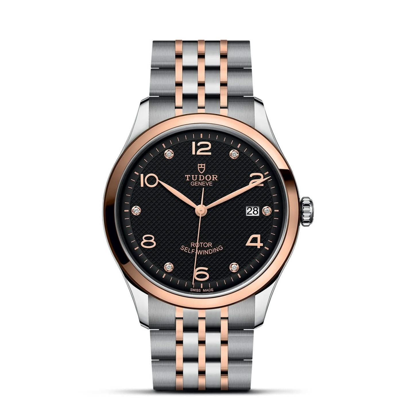 Stainless steel and 18K rose gold TUDOR 1926 automatic watch featuring a black arabic/diamond date dial with an 18K rose gold bezel and a stainless steel case. The watch case is 39mm and is attached to a stainless steel and 18K rose gold bracelet.