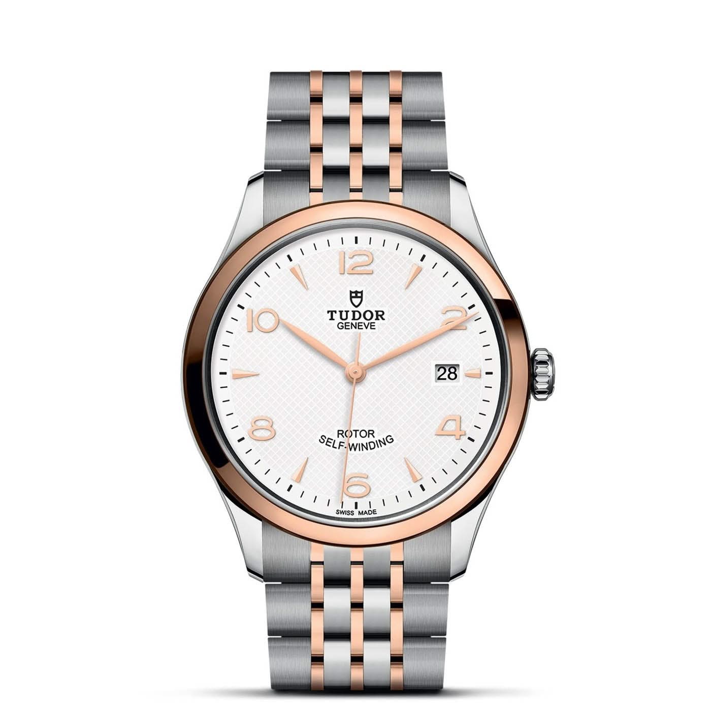 Stainless steel TUDOR 1926 automatic watch featuring an opaline and blue index/arabic date dial with a high polished bezel and case. The watch case is 39mm and is attached to a brown leather strap.