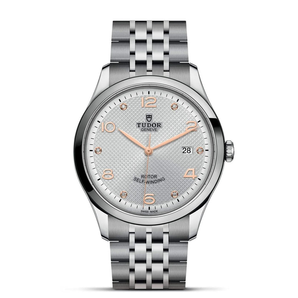Stainless steel TUDOR 1926 automatic watch featuring a white arabic/diamond date dial with a high polished bezel and case. The watch case is 41mm and is attached to a stainless steel bracelet.
