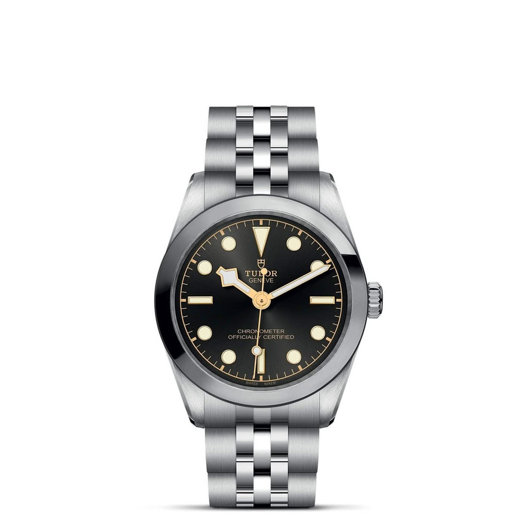 Stainless steel Tudor Black Bay automatic watch featuring a black index dial with a stainless steel bezel and case. The watch case is 31mm and is attached to a stainless steel bracelet.