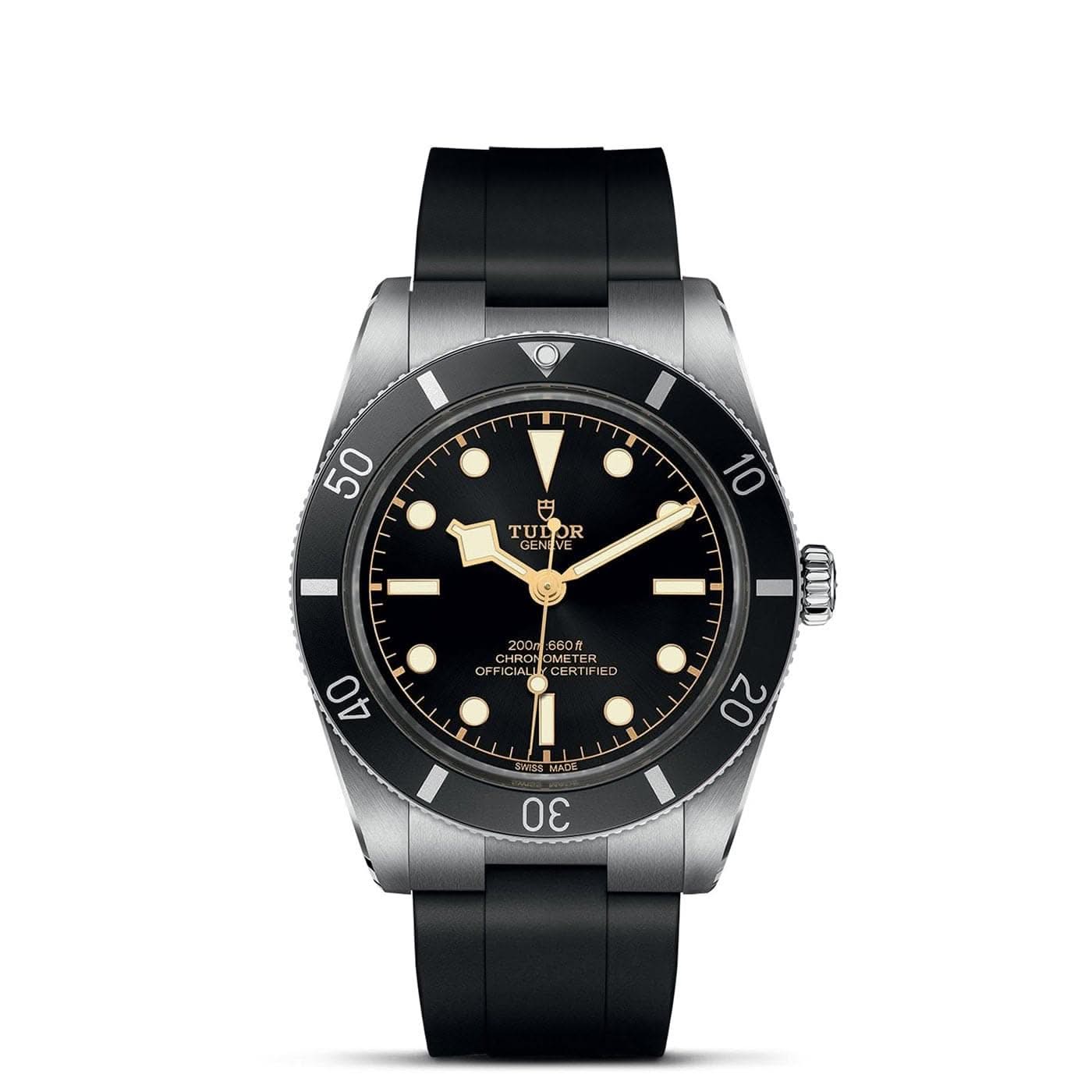 Stainless steel Tudor Black Bay 54 automatic watch featuring a black index dial with a stainless steel black aluminum bezel and a stainless steel case. The watch case is 37mm and is attached to a black rubber strap.