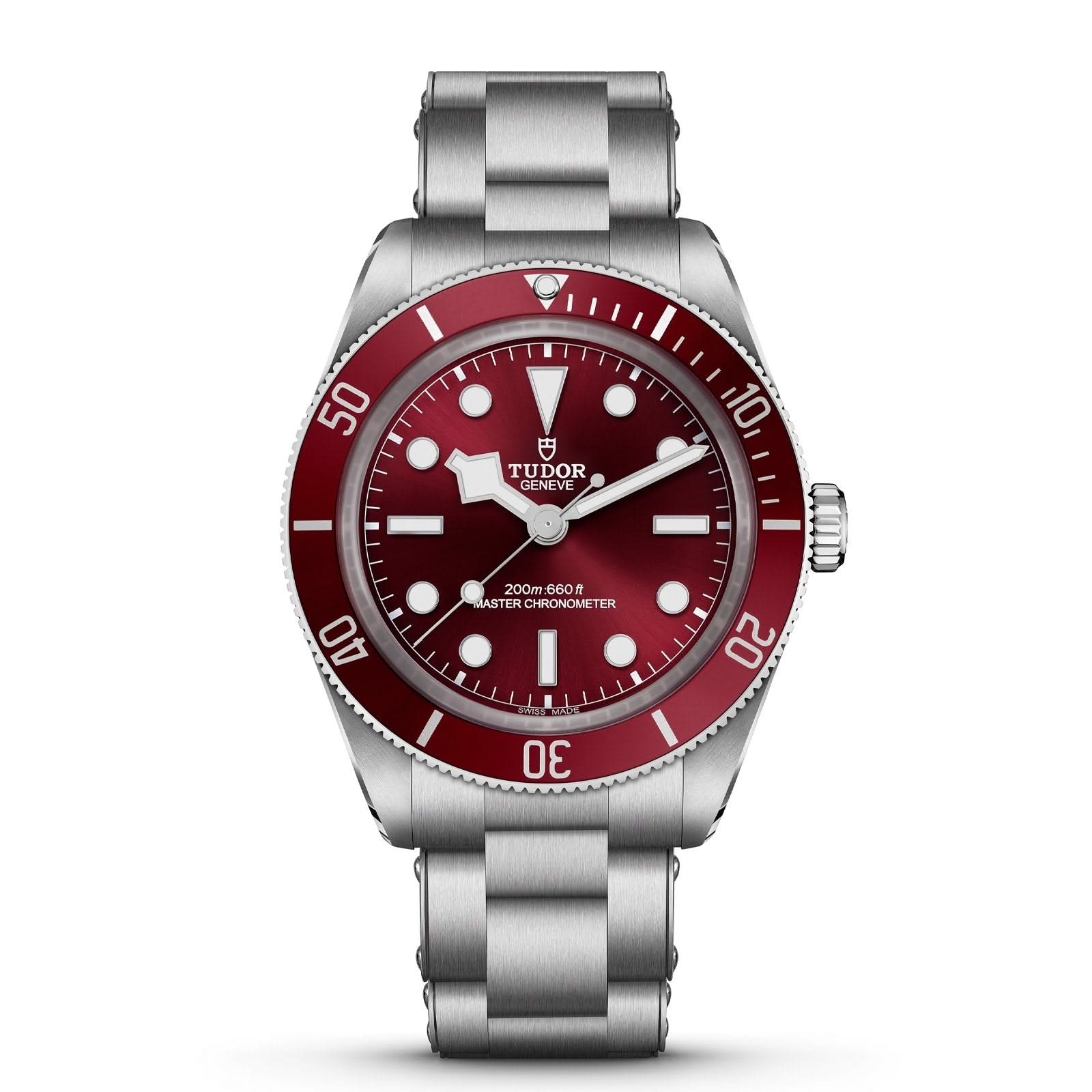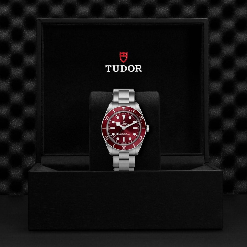 Stainless steel TUDOR Black Bay 58 automatic watch featuring a burgundy index dial with a stainless steel burgundy aluminium insert bezel and a stainless steel case. The watch case is 39mm and is attached to a stainless steel 3-link bracelet. M7939A1A0RU-0002 (model number)