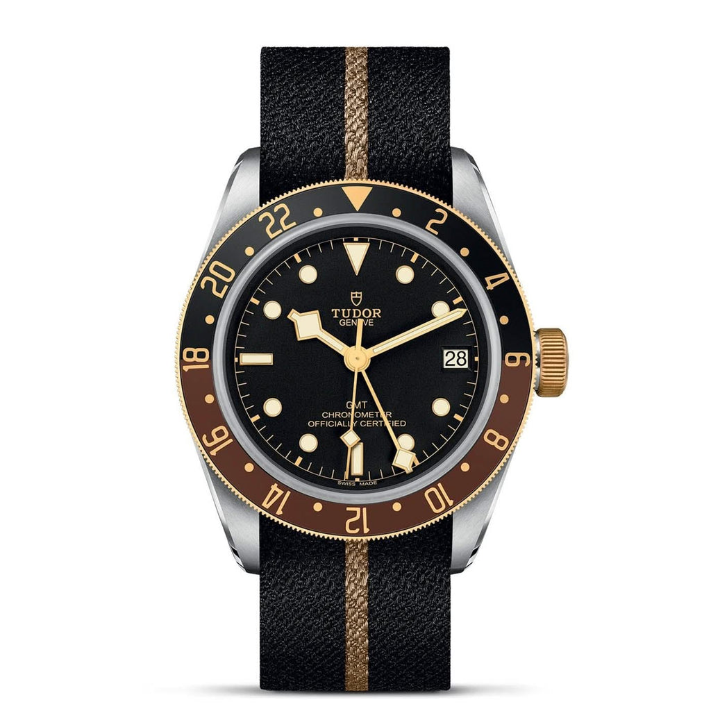 Stainless steel and 18K yellow gold TUDOR Black Bay GMT automatic watch featuring a black index date dial with a black and brown bezel and a stainless steel case. The watch case is 41mm and is attached to a black fabric strap with beige band.