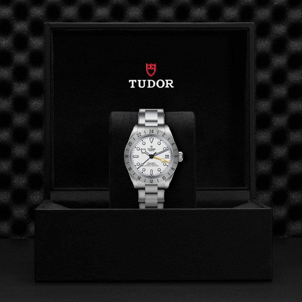 Stainless steel TUDOR Black Bay Pro automatic watch featuring a white index date dial with a stainless steel bezel and case. The watch case is 39mm and is attached to a stainless steel bracelet. M79470-0004 (model number)