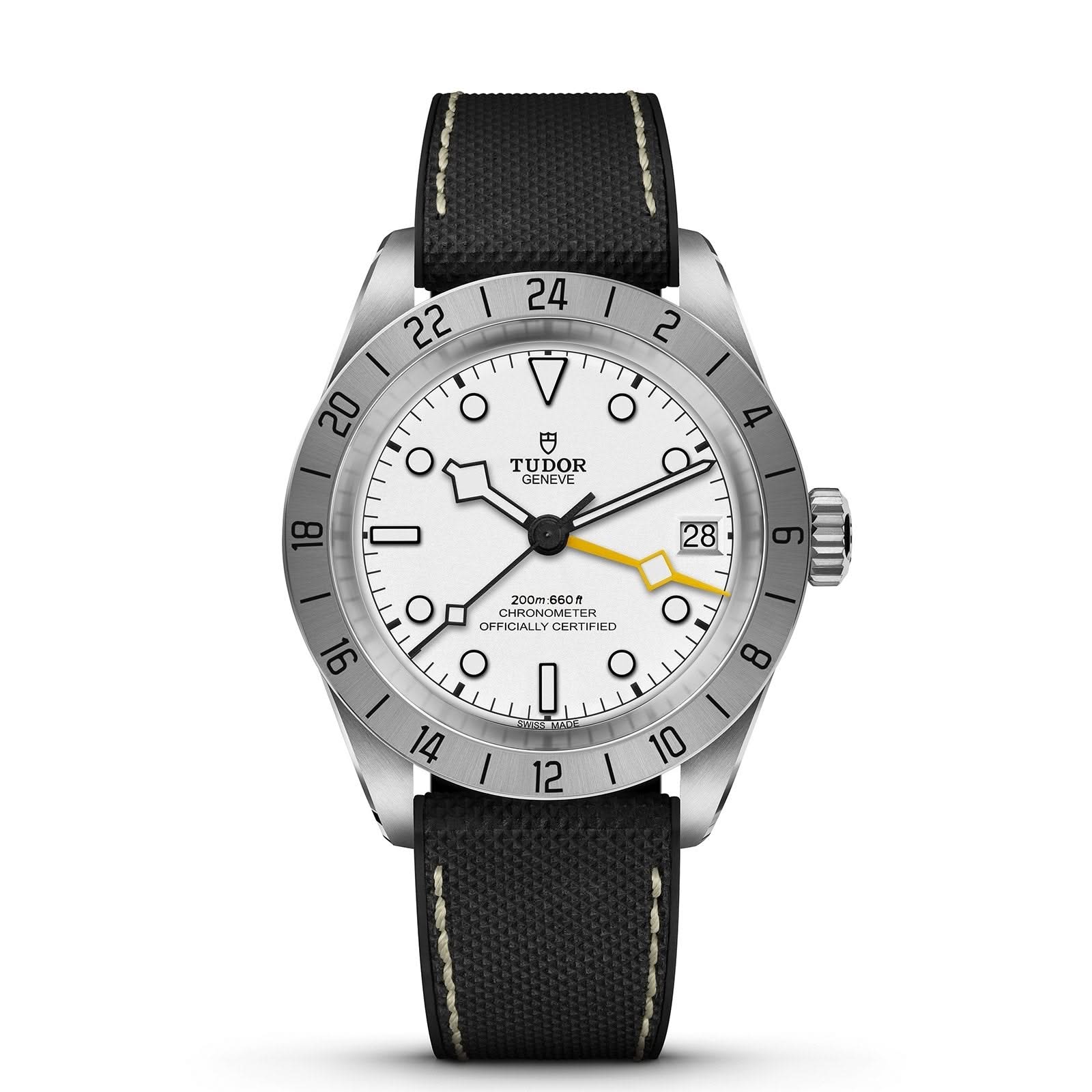 Stainless steel TUDOR Black Bay Pro automatic watch featuring a white index date dial with a stainless steel bezel and case. The watch case is 39mm and is attached to a black hybrid rubber and leather strap. M79470-0006 (model number)