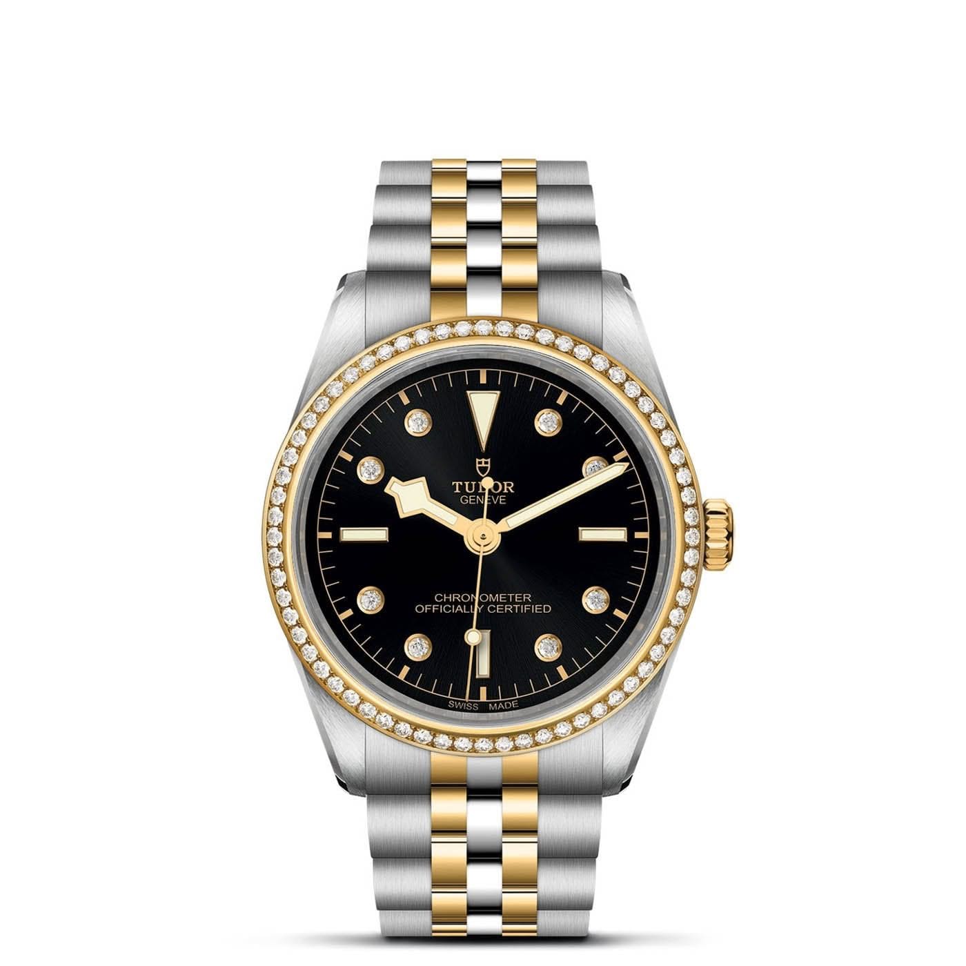 Stainless steel and 18K yellow gold TUDOR Black Bay S&G automatic watch featuring a silver index dial with an 18K yellow gold bezel and a stainless steel case. The watch case is 36mm and is attached to a stainless steel and 18K yellow gold bracelet.