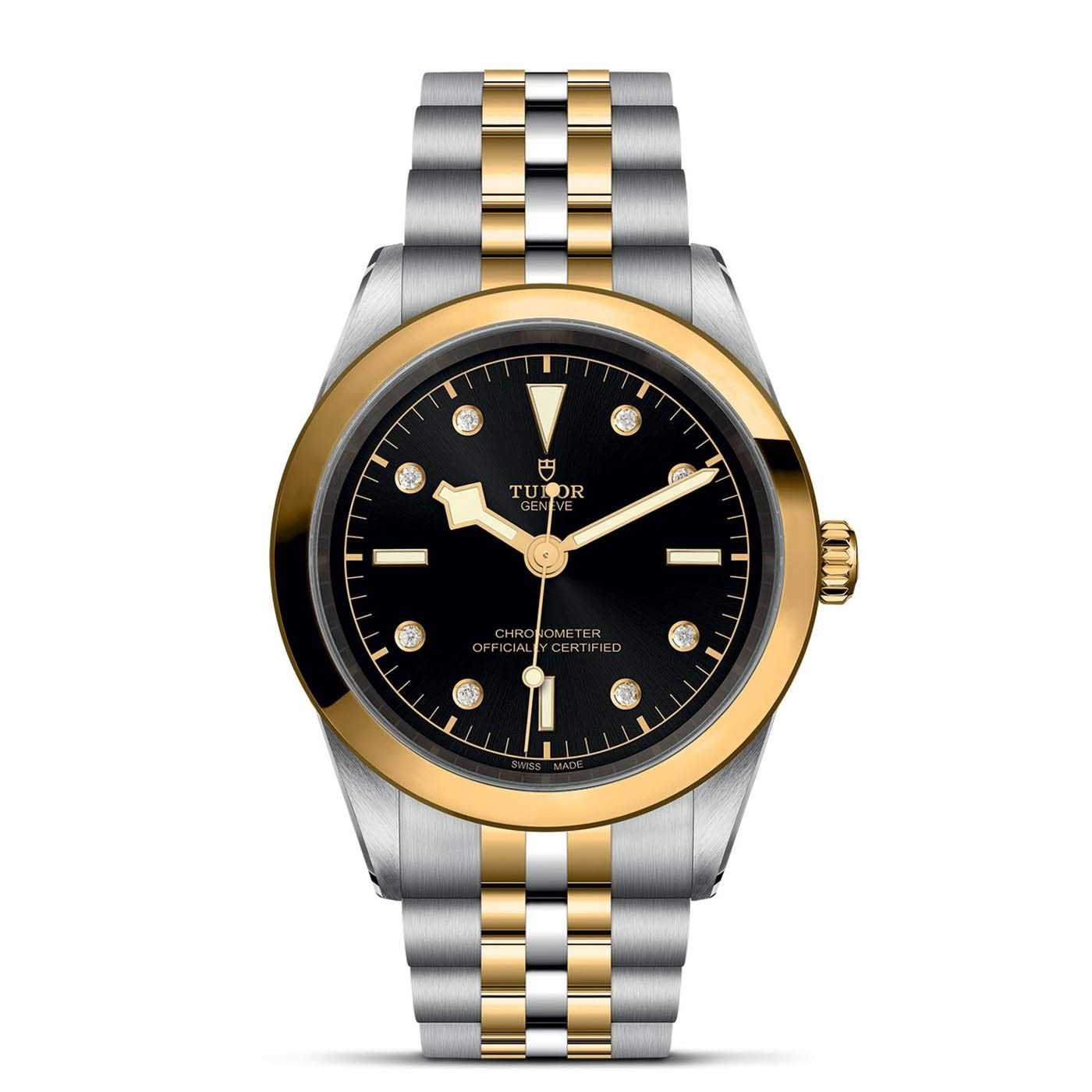 Stainless steel and 18K yellow gold TUDOR Black Bay S&G automatic watch featuring a black index/diamond dial with an 18K yellow gold bezel and a stainless steel case. The watch case is 41mm and is attached to a stainless steel and 18K yellow gold bracelet.