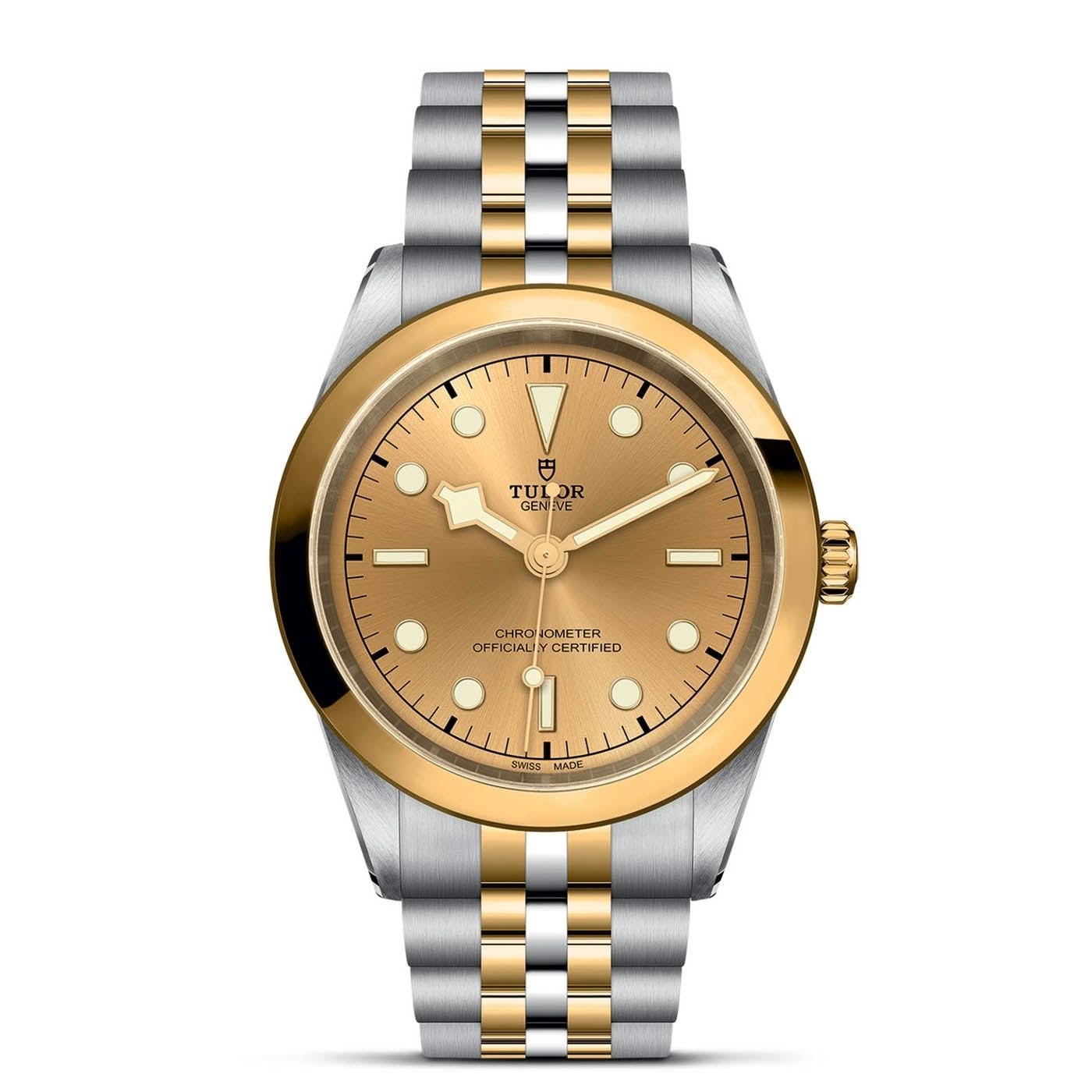Stainless steel and 18K yellow gold Tudor Black Bay S&G automatic watch featuring a champagne index dial with an 18K yellow gold bezel and a stainless steel case. The watch case is 41mm and is attached to a stainless steel and 18K yellow gold bracelet.