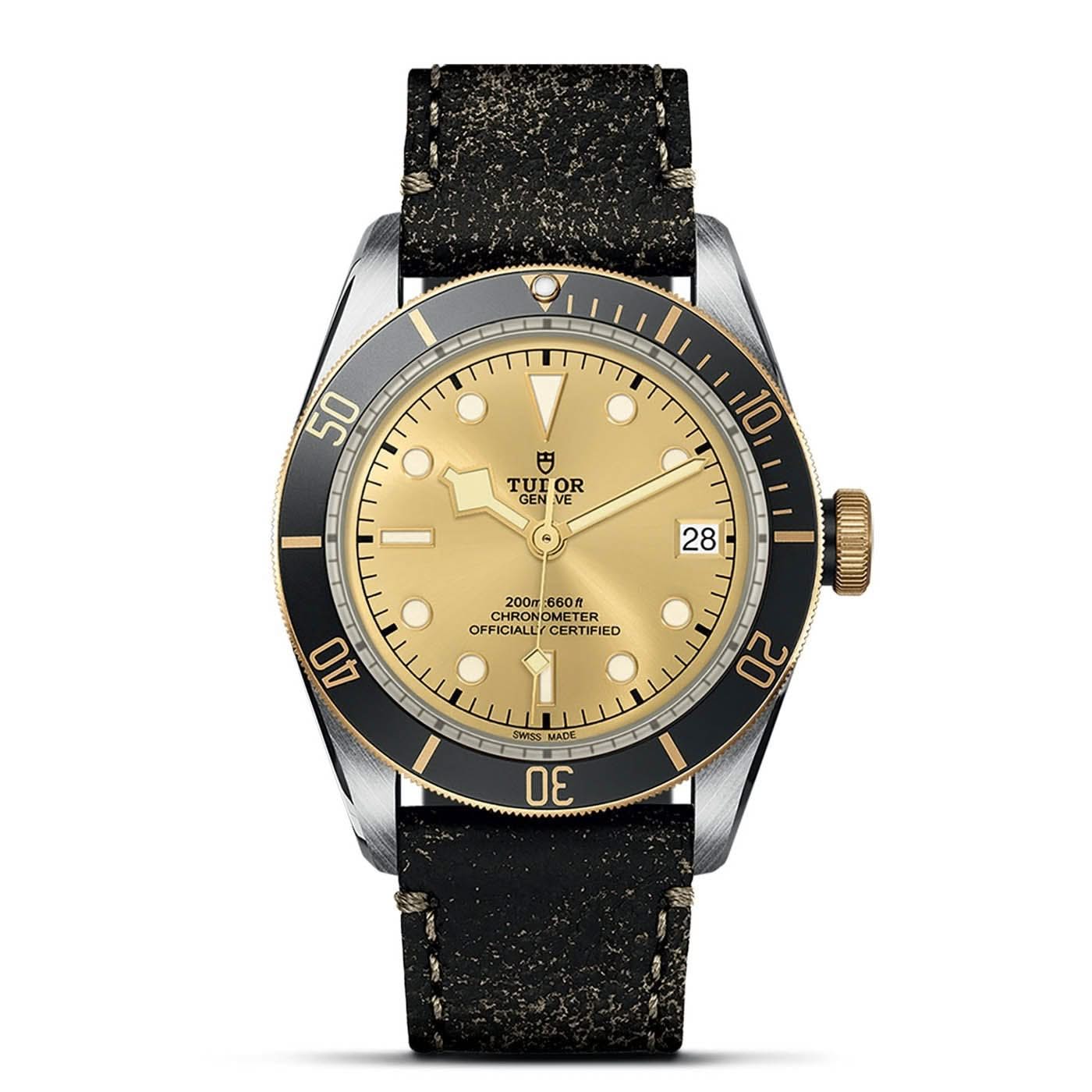 Stainless steel and 18K yellow gold Tudor Black Bay S&G automatic watch featuring a champagne index date dial with an 18K yellow gold black aluminum bezel and a stainless steel case. The watch case is 41mm and is attached to a brown vintage leather strap.