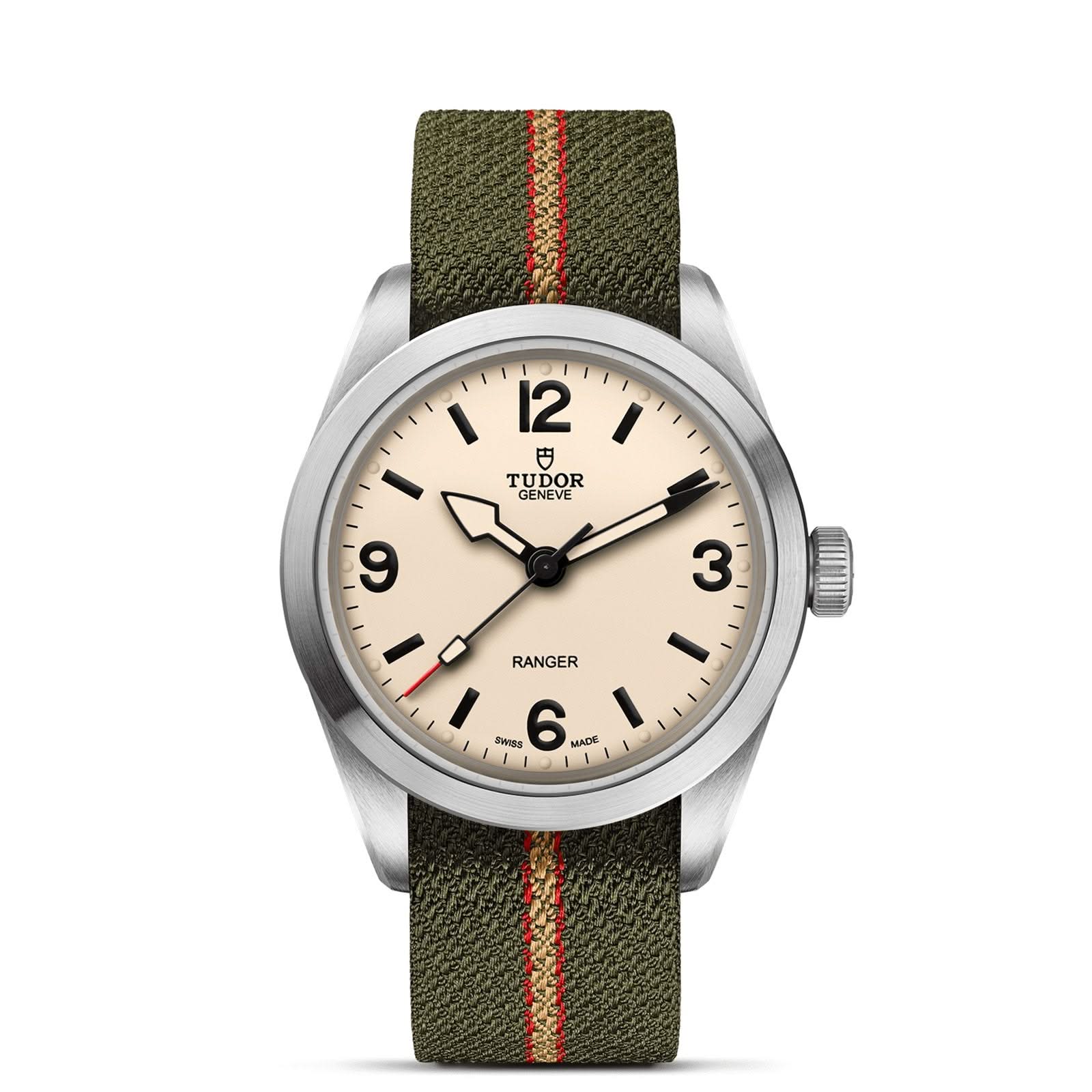 Stainless steel TUDOR Ranger automatic watch featuring a beige index/arabic dial with a stainless steel bezel and case. The watch case is 39mm and is attached to a green fabric strap with red and beige stripes.