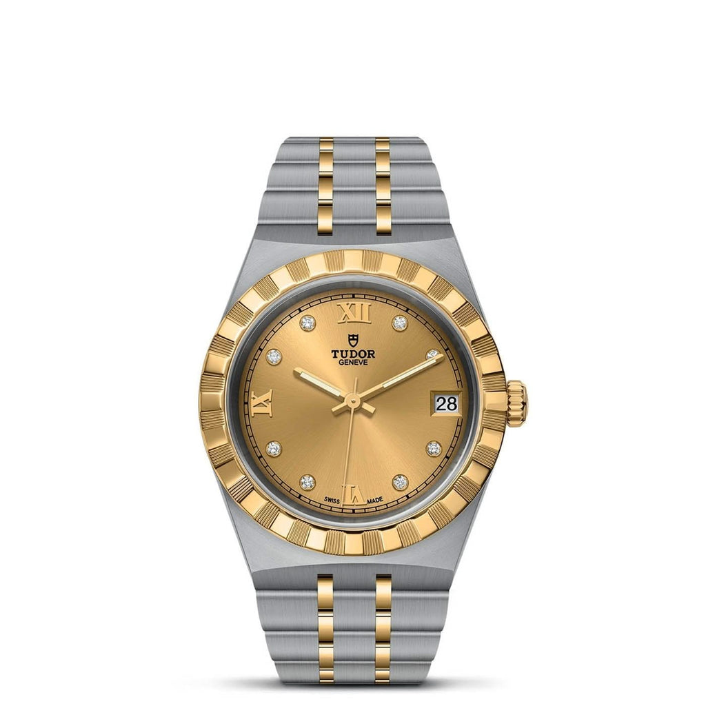 Stainless steel and 18K yellow gold TUDOR Royal automatic watch featuring a chocolate brown Roman/diamond date dial with an 18K yellow gold notched bezel and a stainless steel case. The watch case is 34mm and is attached to a stainless steel and 18K yellow gold bracelet.