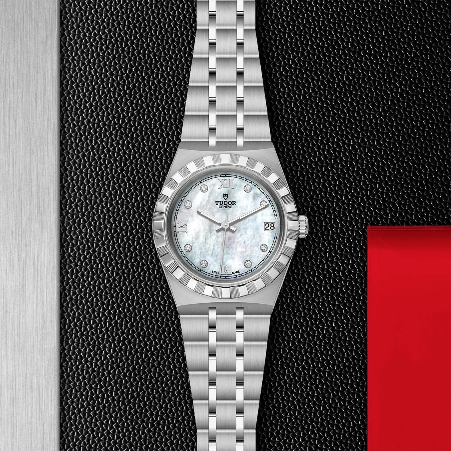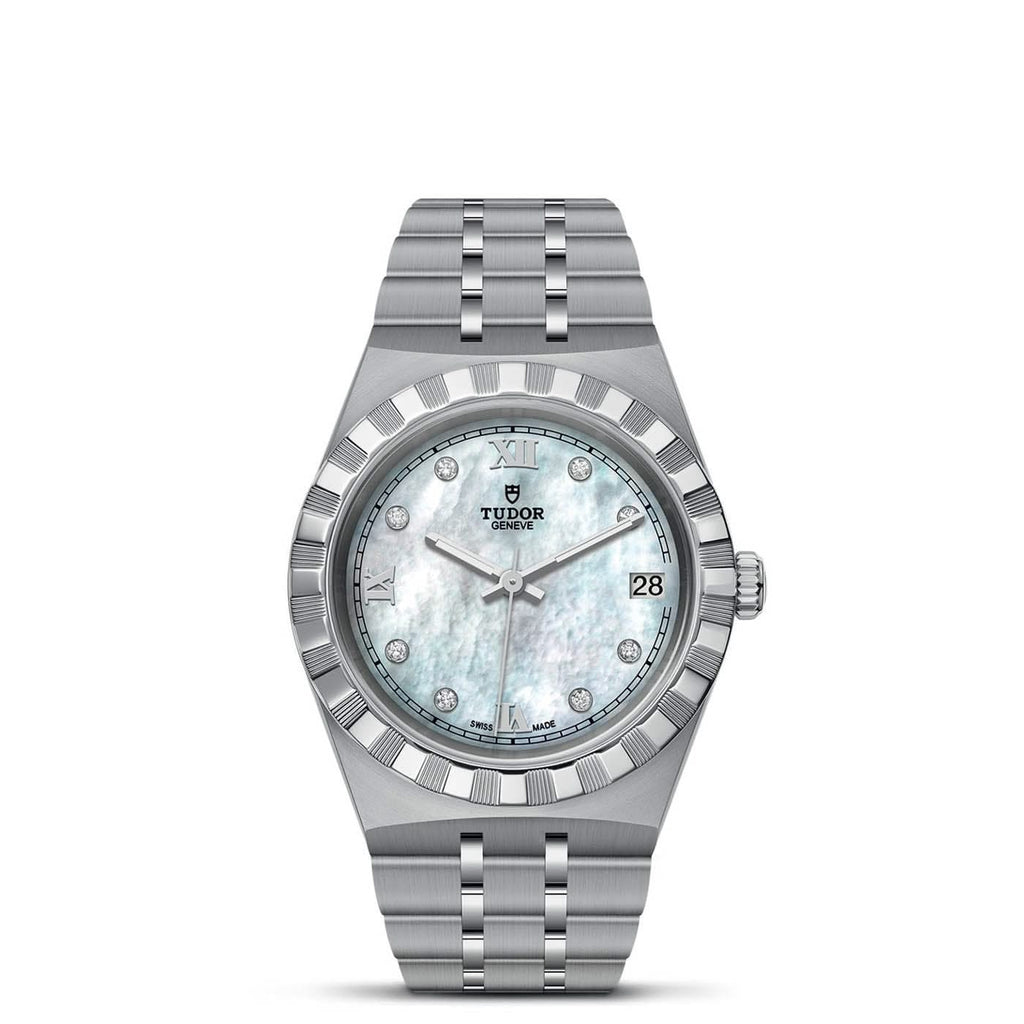 Stainless steel and 18K yellow gold TUDOR Royal automatic watch featuring a champagne Roman/diamond date dial with an 18K yellow gold notched bezel and a stainless steel case. The watch case is 34mm and is attached to a stainless steel and 18K yellow gold bracelet.