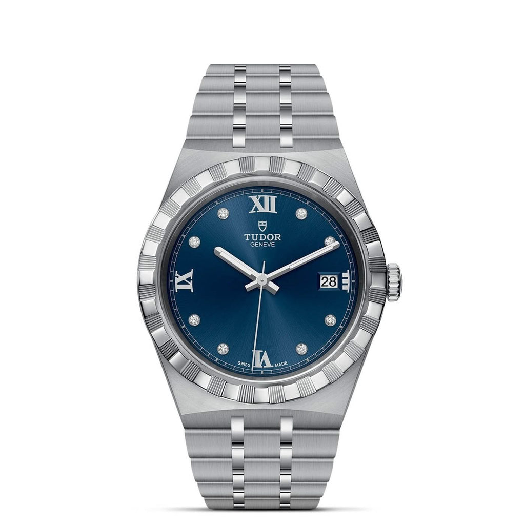 Stainless steel and 18K yellow gold TUDOR Royal automatic watch featuring a champagne Roman/diamond date dial with an 18K yellow gold notched bezel and a stainless steel case. The watch case is 38mm and is attached to a stainless steel and 18K yellow gold bracelet.
