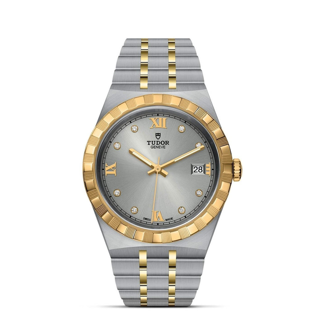 Stainless steel and 18K yellow gold TUDOR Royal automatic watch featuring a silver Roman/diamond date dial with an 18K yellow gold notched bezel and a stainless steel case. The watch case is 38mm and is attached to a stainless steel and 18K yellow gold bracelet.