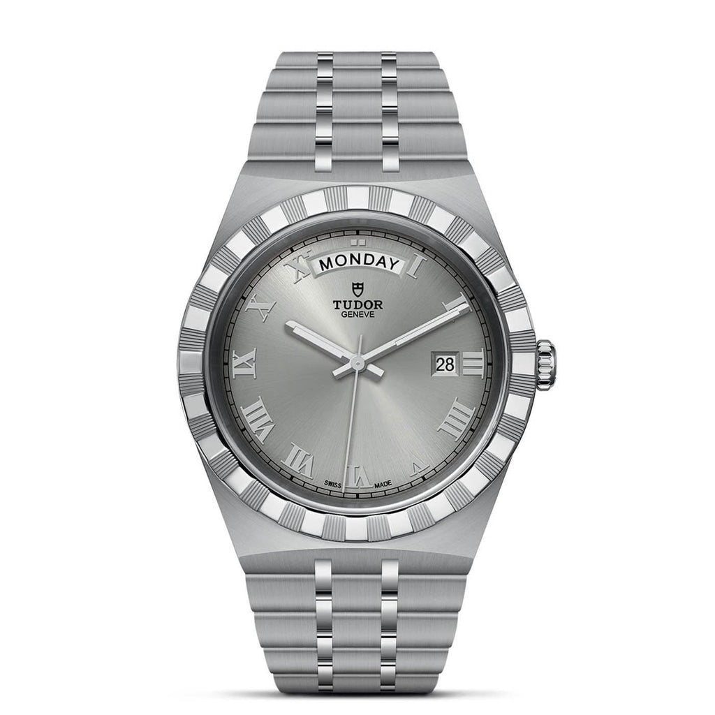 Stainless steel and 18K yellow gold TUDOR Royal automatic watch featuring a champagne Roman/diamond day-date dial with an 18K yellow gold notched bezel and a stainless steel case. The watch case is 41mm and is attached to a stainless steel and 18K yellow gold bracelet.