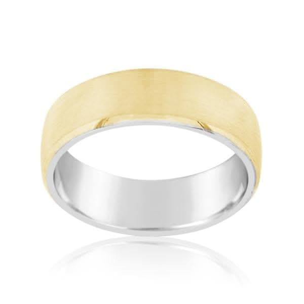 14K yellow and white gold comfort fit wedding band featuring a satin finish white gold center with high polish yellow gold edges. The band is 8mm wide. Size 10 in stock now. Special order sizes available. Pricing may vary with size of ring.
