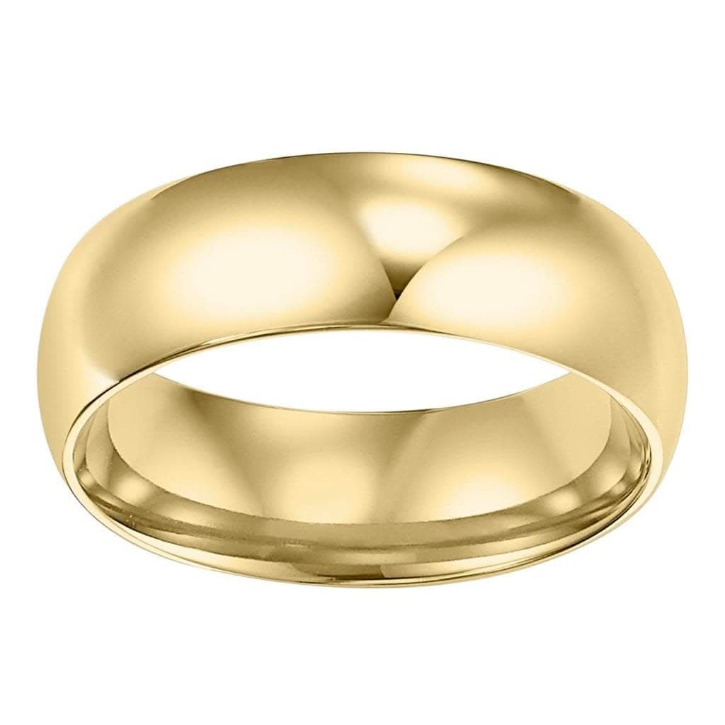 14K yellow gold comfort fit low dome wedding band from the Reis-Nichols Collection. The band is 7mm wide. Size 9 in stock now. Special order sizes also available. Pricing may vary with size of ring. Please call or email for size information and availability.