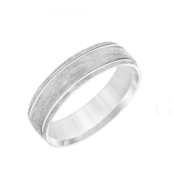 14K white gold wedding band from the Reis-Nichols Collection. The band features a wire finish center and two high polish lines. The band is 6mm wide. Please call or email for size information and availability.