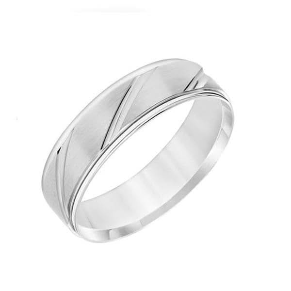 14K white gold comfort fit wedding band from the Reis-Nichols Collection. The band features a satin finish center with high polish diagonal lines. The band is 6mm wide. Please call or email for size information and availability.